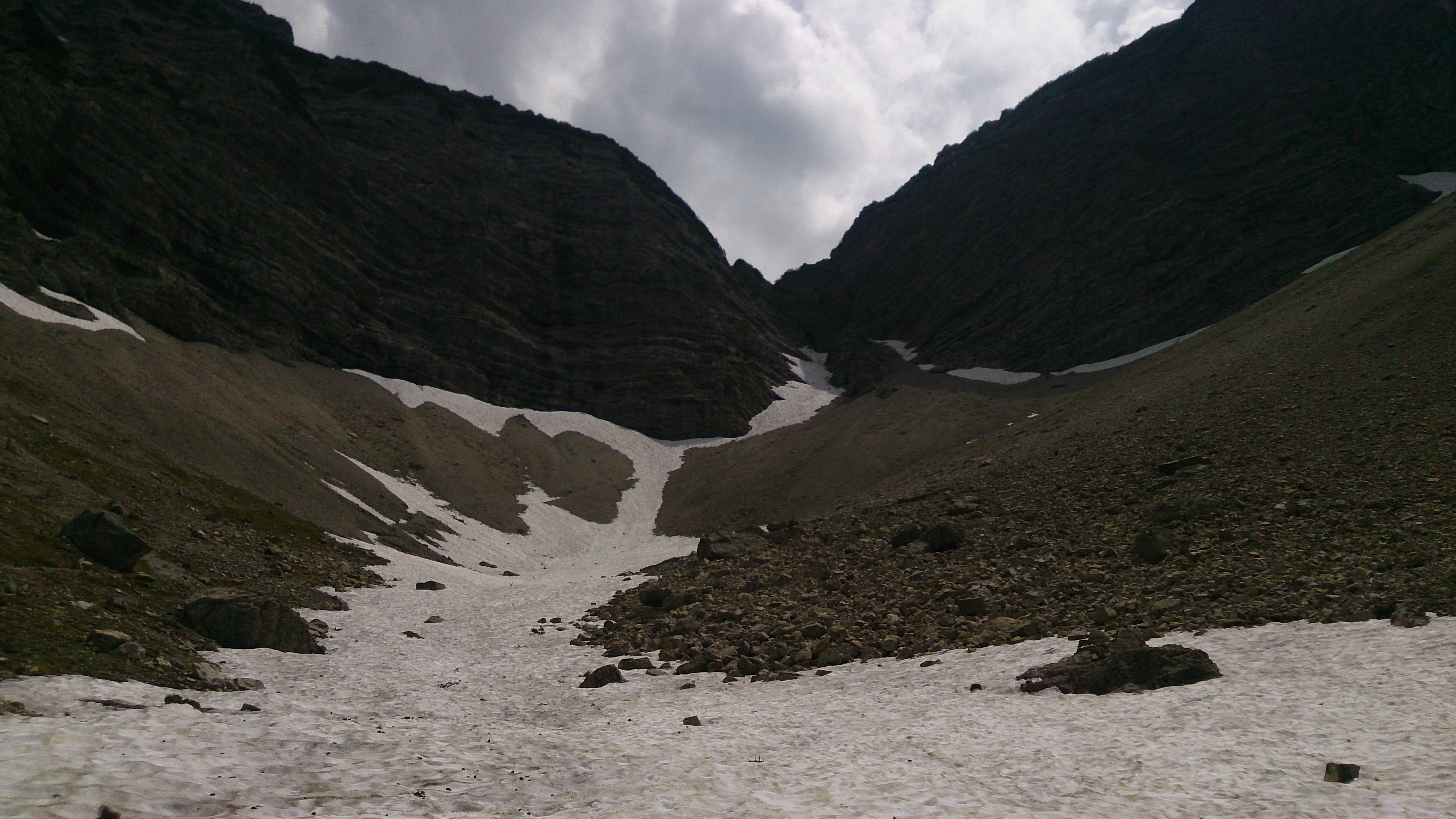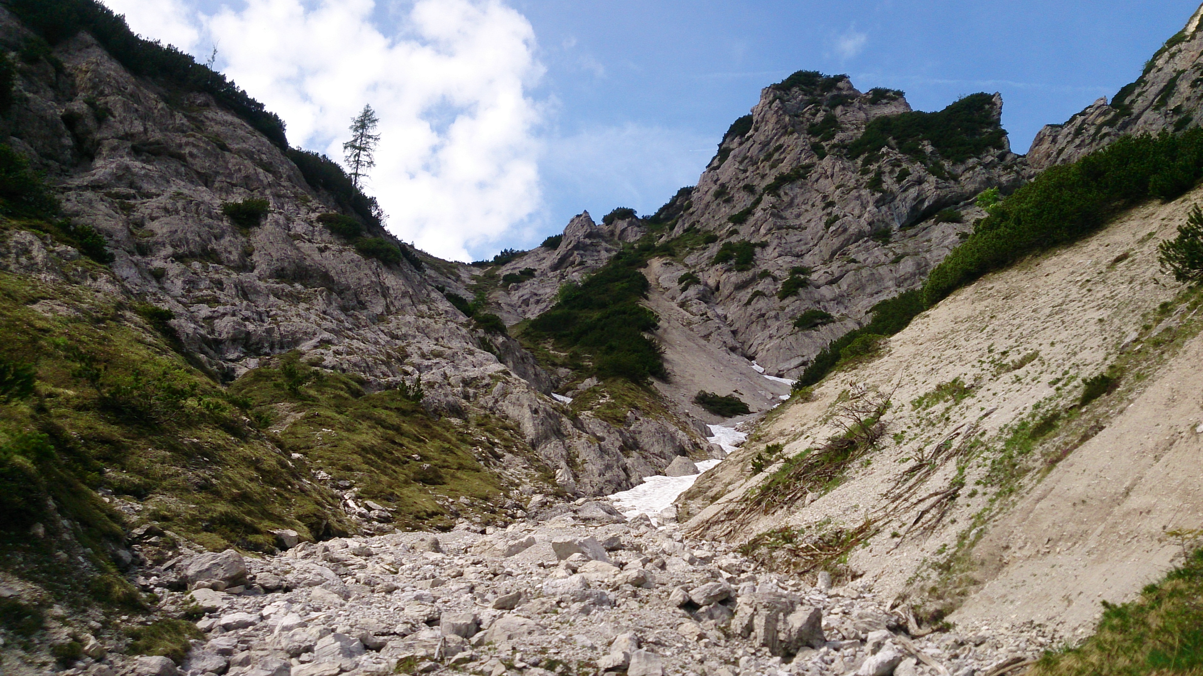 Das Schneefeld im Mittleren Kraxenbacher, ganz oben wie geschrieben nicht zu umgehen:
