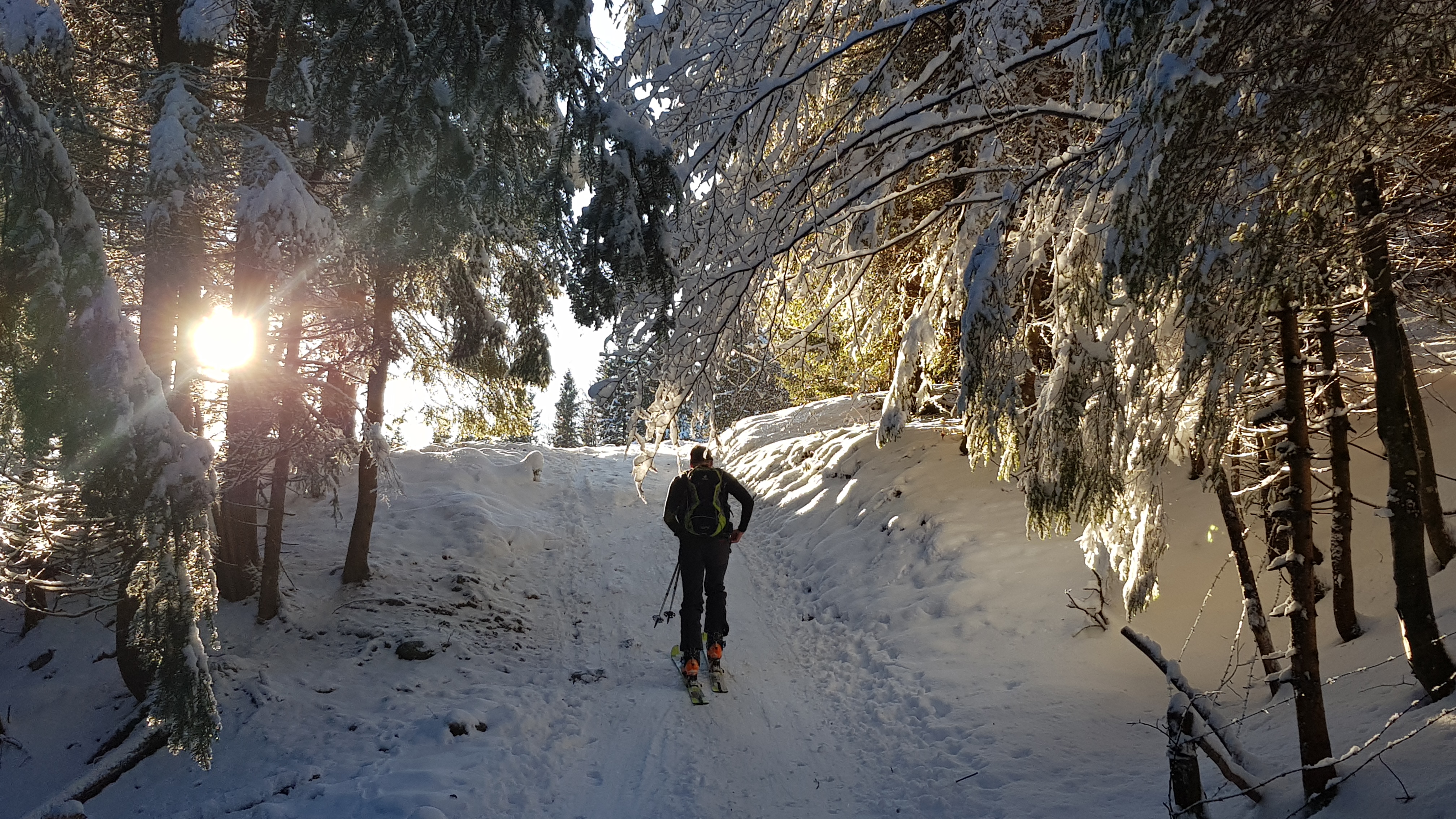 Sonstiges: Der Weg durch den Wald hat zum Teil sehr wenig Schnee, Steine schauen ab und zu raus. Die Abfahrt auf der Piste ist kunstschneebedingt vereist. Alles in allem nur Dank der herrlichen Wintersonne und dem Blick in die Hauptalpen eine schöne Tour heute.