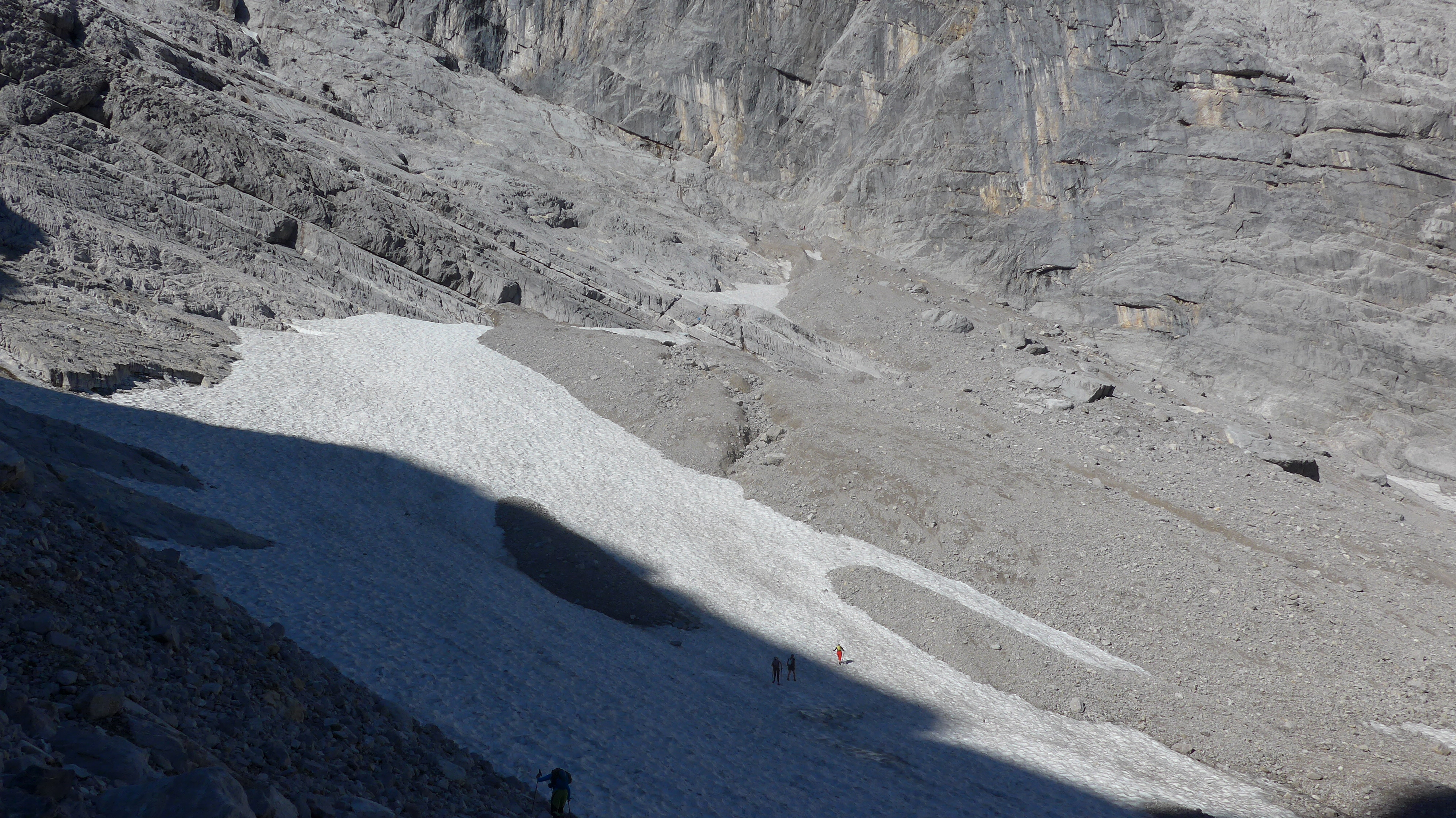 Tourenverhältnisse: Gletscher(-rest) mit Stöcke gut zu gehen. Einstiegsrinne 70 m ist die brüchigste Passage der Route - z.T. mit Bohrhaken.