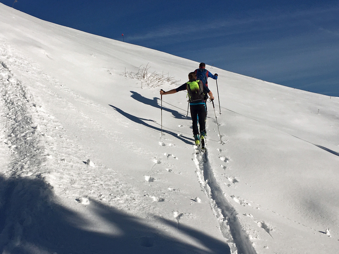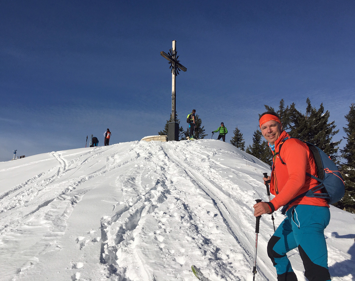Tourenverhältnisse: Zugegebenermaßen, wir waren etwas skeptisch nach einem Facebook-Log, der von überraschend guten Verhältnissen berichtete. Die Rücksprache mit einem ortsansässigen Bergwachtler ermunterte uns aber, es ohne Steinski zu wagen. Und ja, es geht prima! Der Parkplatz am Draxlhang (2 Euro) ist dick zugeschneit, am gesamten Brauneck wurde auch schon maschinell beschneit. Die Kunst war es, die richtige Balance zwischen Kunst- un Naturschnee zu finden. Austieg natürlich kein Problem. Aber auch die Abfahrt ging erstaunlich gut und ohne Steinkontakt. Im Gipfelbereich 40 cm Neuschnee - super Pulver, traumhaft zu fahren. Im Pistengebiet wurde nur bruchstückhaft gewalzt. Dort, wo der Kunstschnee dominiert, kann es unangenehm werden - also entweder den Naturpulver erspüren oder sich ins verspurte Gelände stürzen (da geht es auch gut). Unsere Sorge, der Bachhang oberhalb vom Milchhäusl könnte steinig sein: unbegründet. Hier wurde schon massiv beschneit, kein Steinkontakt. Die letzten Schwünge über den Draxlhang führen einen nonstop zum Parkplatz. Fazit: Es geht echt schon gut am Brauneck.