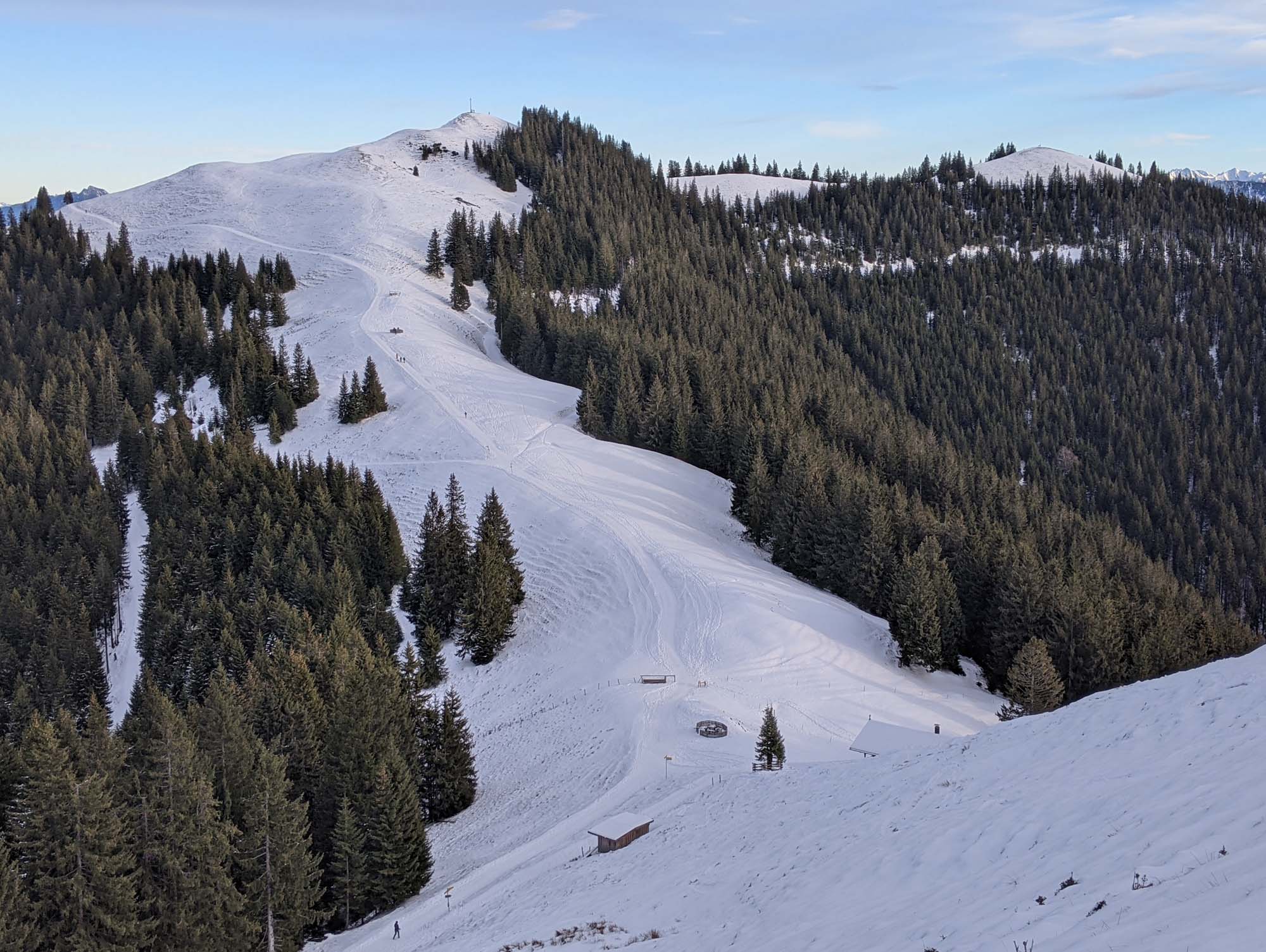 Tourenverhältnisse: Der Aufstieg über die (beim Hörnle ja nicht beschneite) Skipiste war gut möglich ... die Abfahrt gerade so noch möglich. Aber immer wieder Bodenkontakt. Man muss sehr gut auf Steine achten!