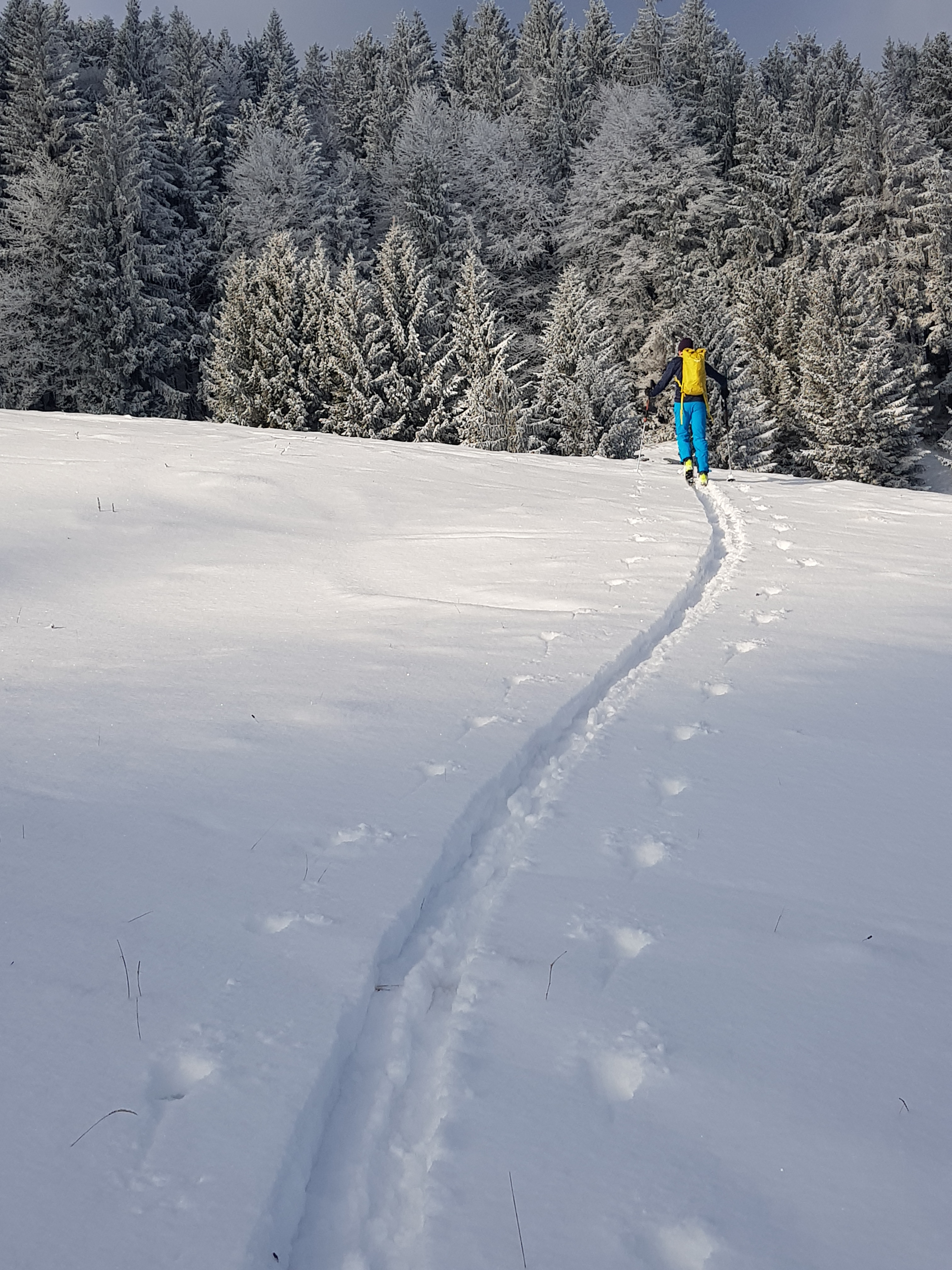 Tourenverhältnisse: Heute Nacht muss es hier weitere 5 cm geschneit haben - gesamte Neuschneemenge nun bei ca. 15 cm. Das ist nicht viel hat aber die Verhältnisse durchaus etwas verbessert. Heute war sogar eine vorsichtige Abfahrt im Gelände (Gipfelhang) möglich. Wir haben keinen Stein erwischt, aber da ist definitiv noch Vorsicht geboten. Die Straße runter geht dann eh gut. Die Aufstiegsroute langt gerade so fürs Hochkommen. Aber auf der breiten Forststraße kann man problemlos runterschwingen.