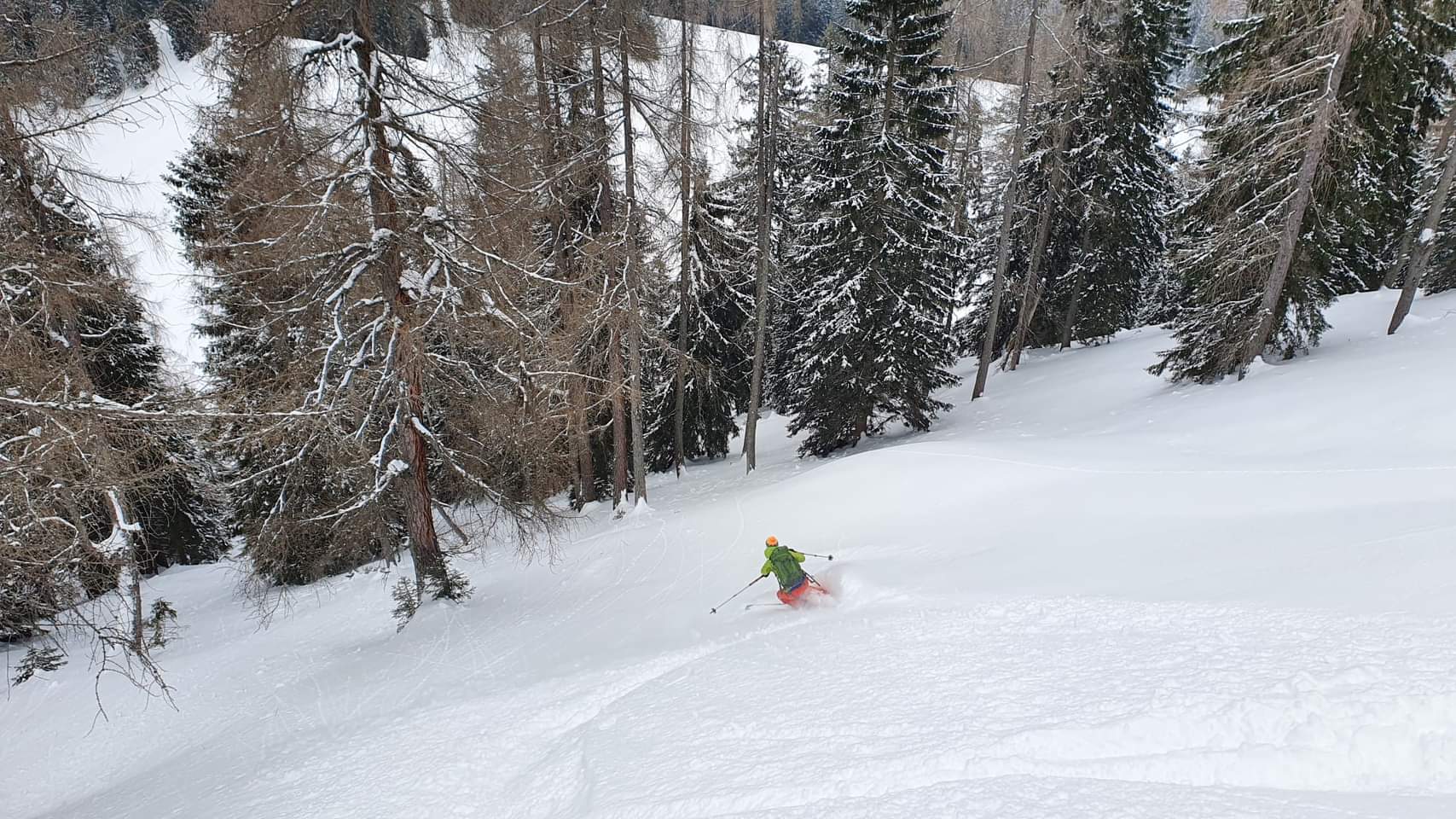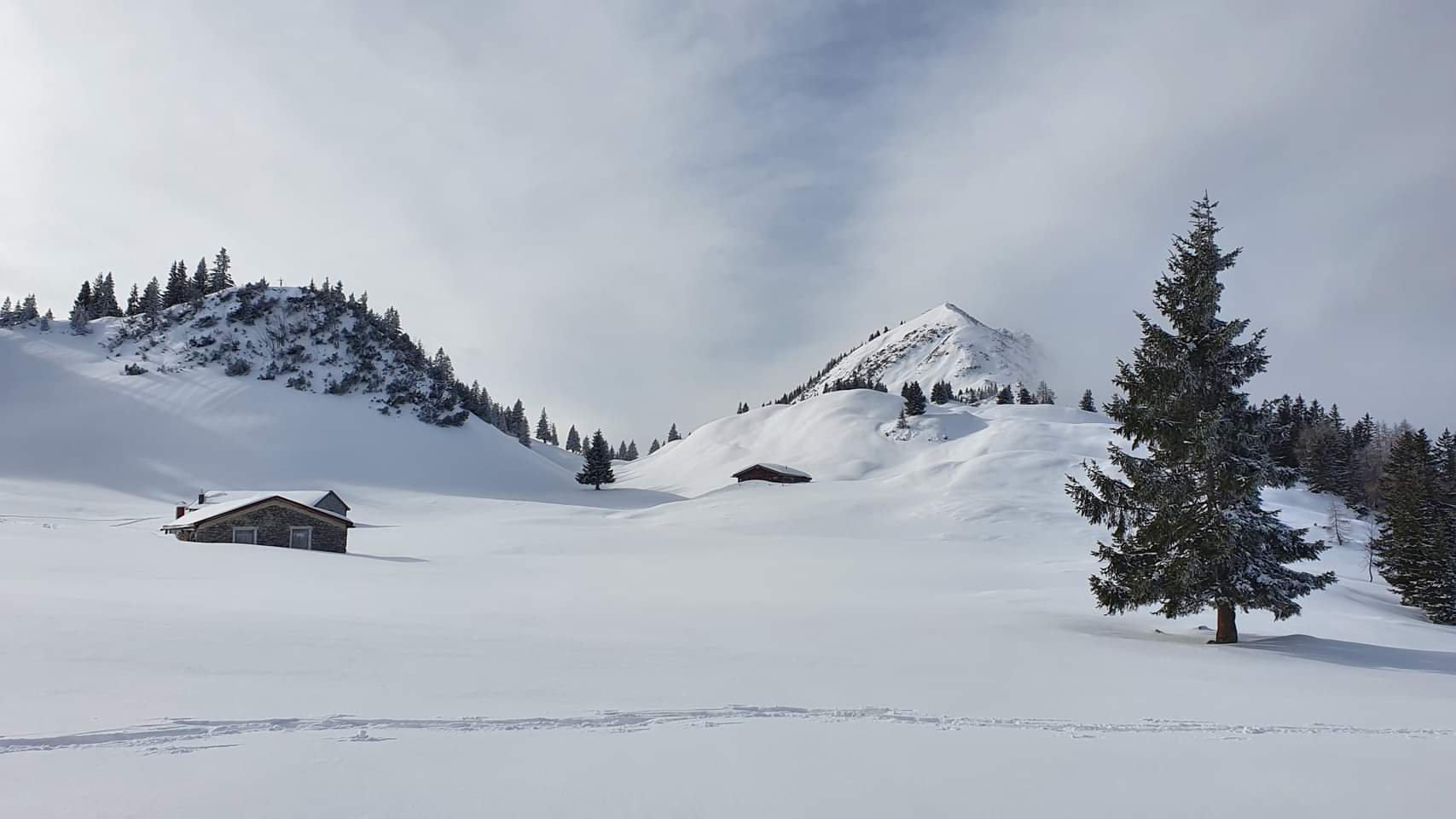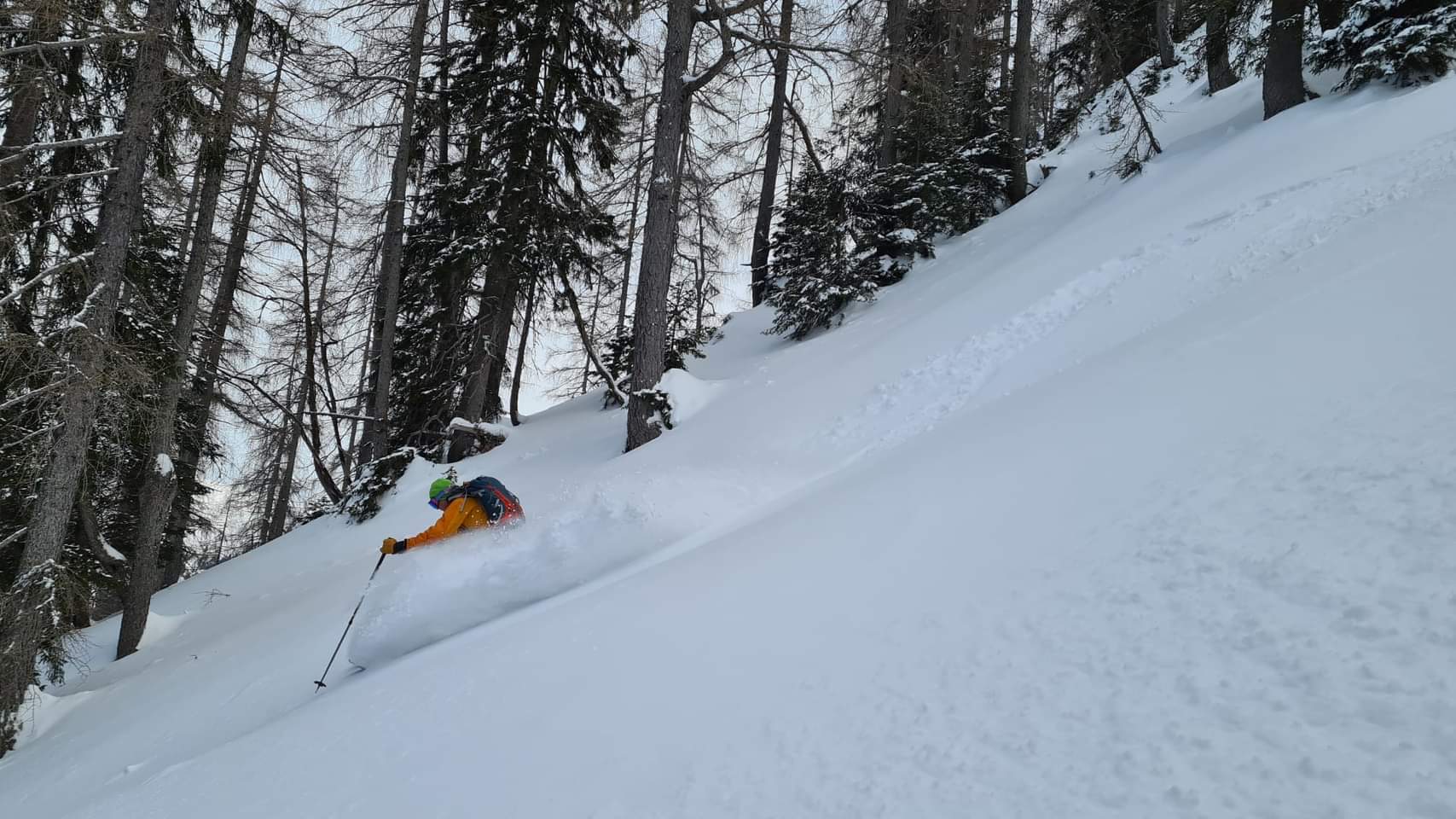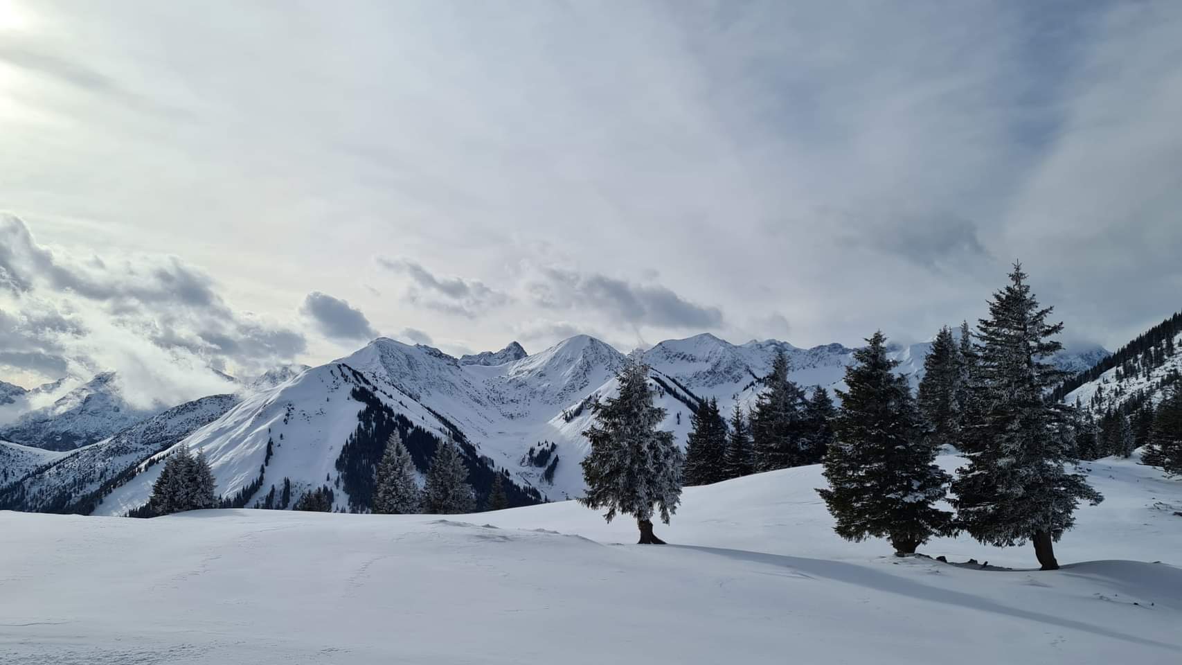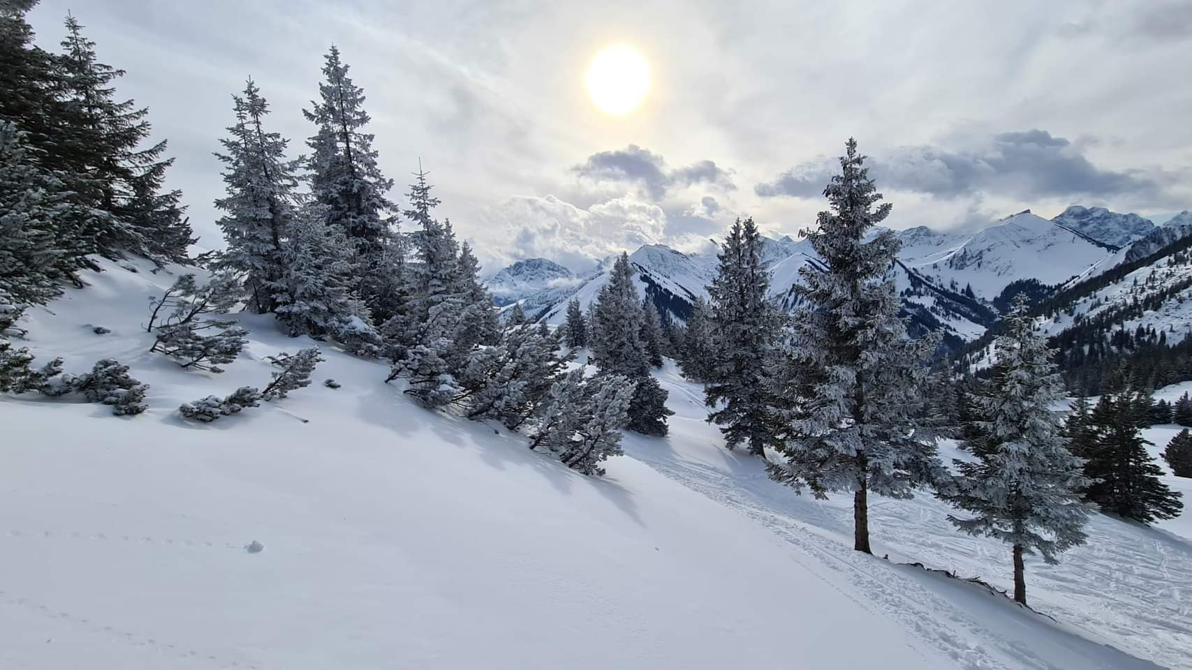 Tourenverhältnisse: überwiegend schöner Pulverschnee und noch Platz für eigene Spuren, zwischendurch ein kurzes Waldstück eng und zerfahren. Am Forstweg kurzer Gegenanstieg (wir haben abgeschnallt und sind zu Fuß gegangen) und zwischendurch immer wieder Schiebe- bzw. Skatingstellen.