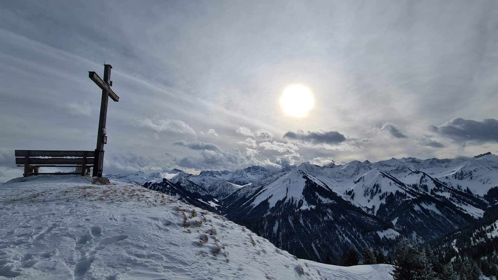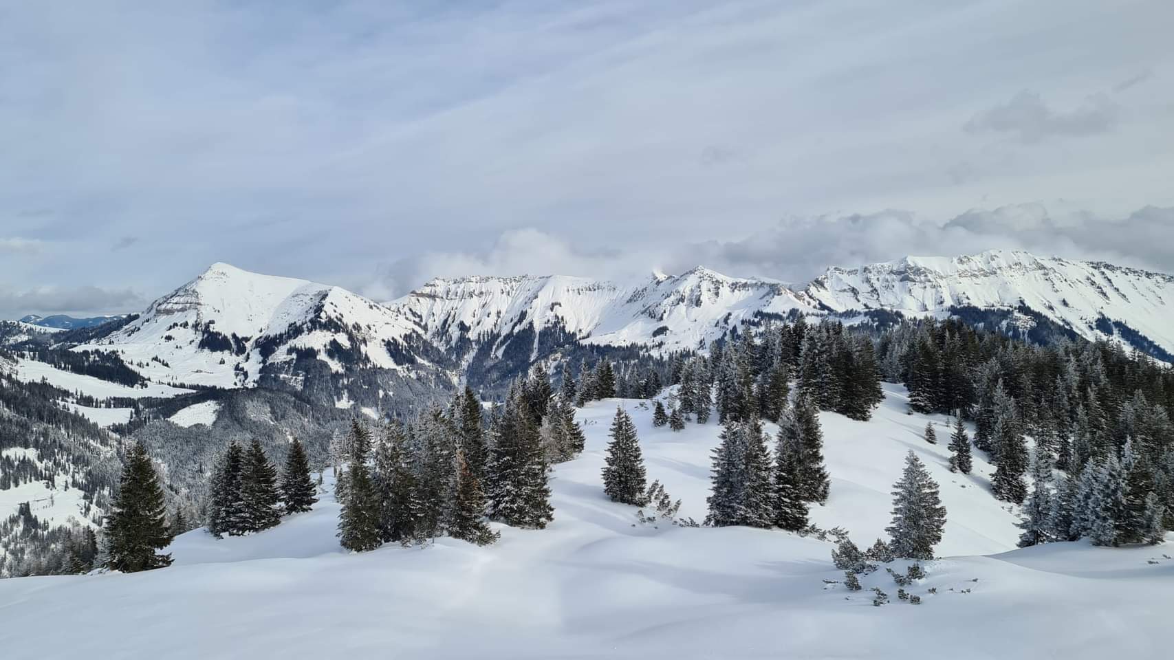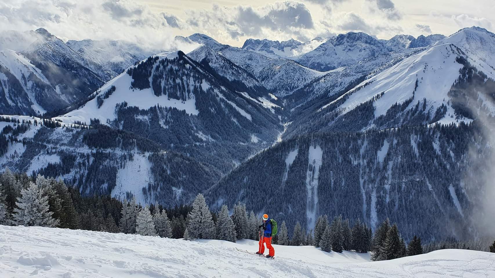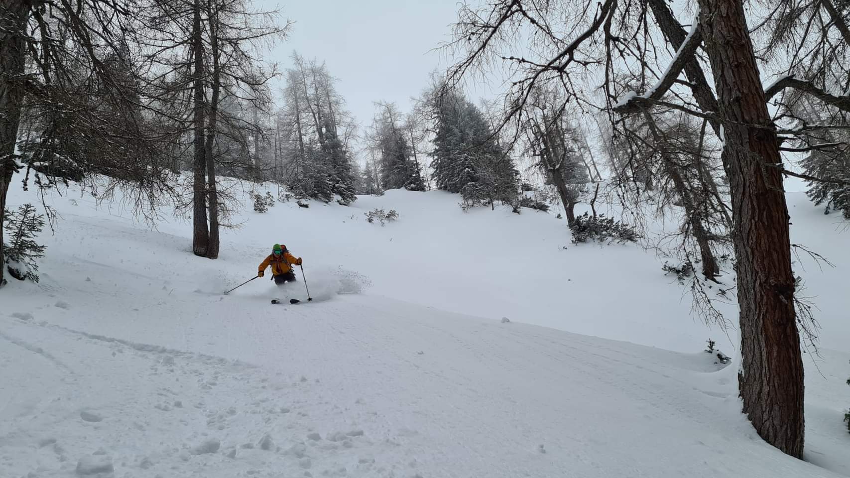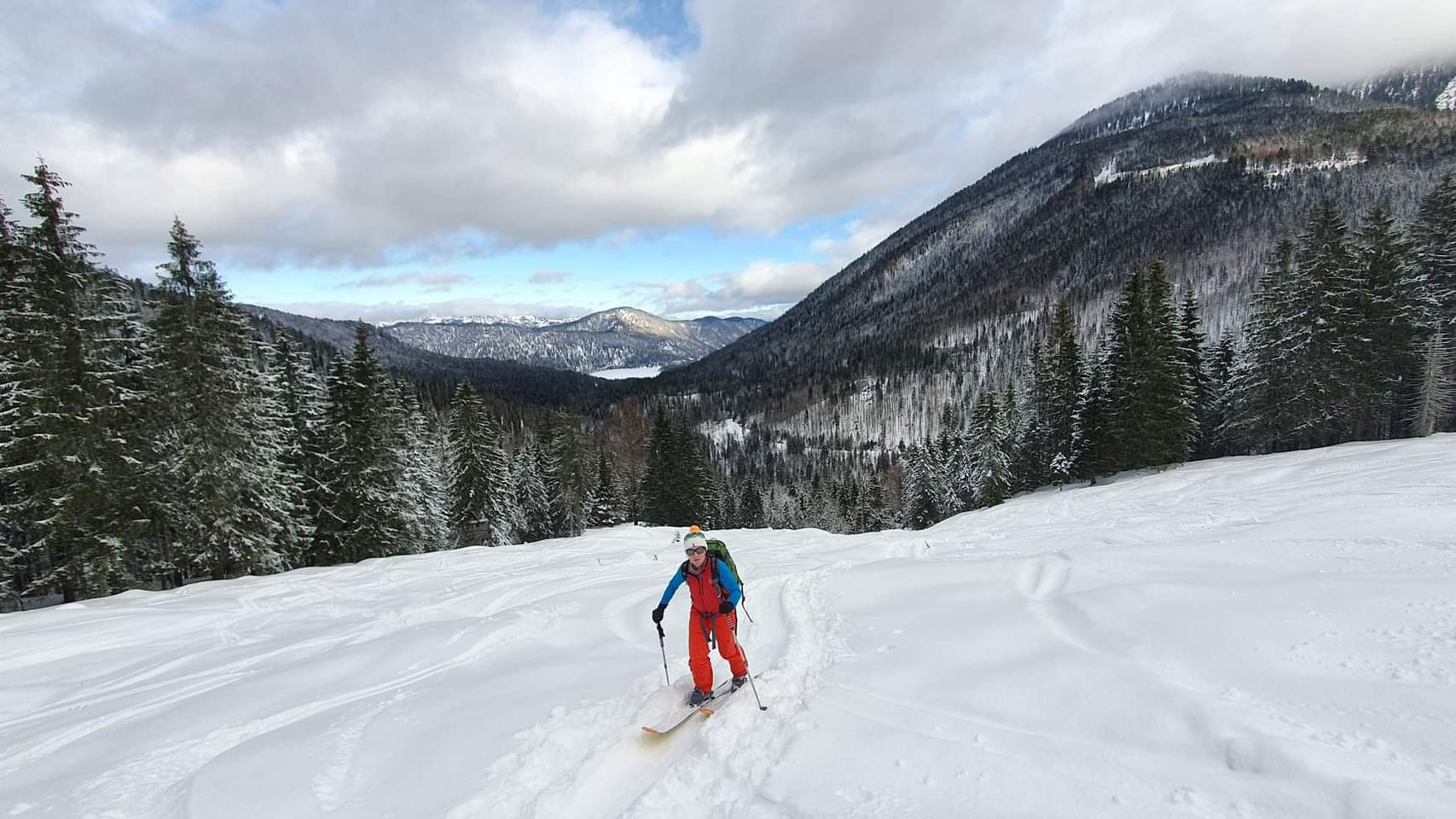 Tourenverhältnisse: überwiegend schöner Pulverschnee und noch Platz für eigene Spuren, zwischendurch ein kurzes Waldstück eng und zerfahren. Am Forstweg kurzer Gegenanstieg (wir haben abgeschnallt und sind zu Fuß gegangen) und zwischendurch immer wieder Schiebe- bzw. Skatingstellen.