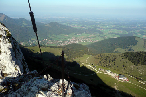Nach vielen Jahren der "Abstinenz" ging es am heutigen Föhn-Tag mal wieder auf die Kampenwand. Mit dem Mountainbike vom Kohlstatt-Parkplatz in Aschau (700 m) via Maiswand und Gorialm zur Steinlingalm, dann zu Fuß weiter (geht für Geübte prima auch mit Radlschuhen) auf oben abgespecktem Fels zum Gipfel, den ich gegen 9.50 Uhr als Erster des Tages erreichte. Neu scheint mir unterhalb des Gipfels die klettersteigartige Metallkette zu sein, die diese Passage vereinfacht. Tolle Sicht! Auch die Kletterüberschreitung des kompletten Kampenwandkamms ist heute gemacht worden, vgl. Foto5. Zur MTB-Auffahrt: Jetzt weiß ich, was (bei der Gori-Alm) 24 Prozent Steigung sind... Runter rollt es sich dafür in 15 Minuten