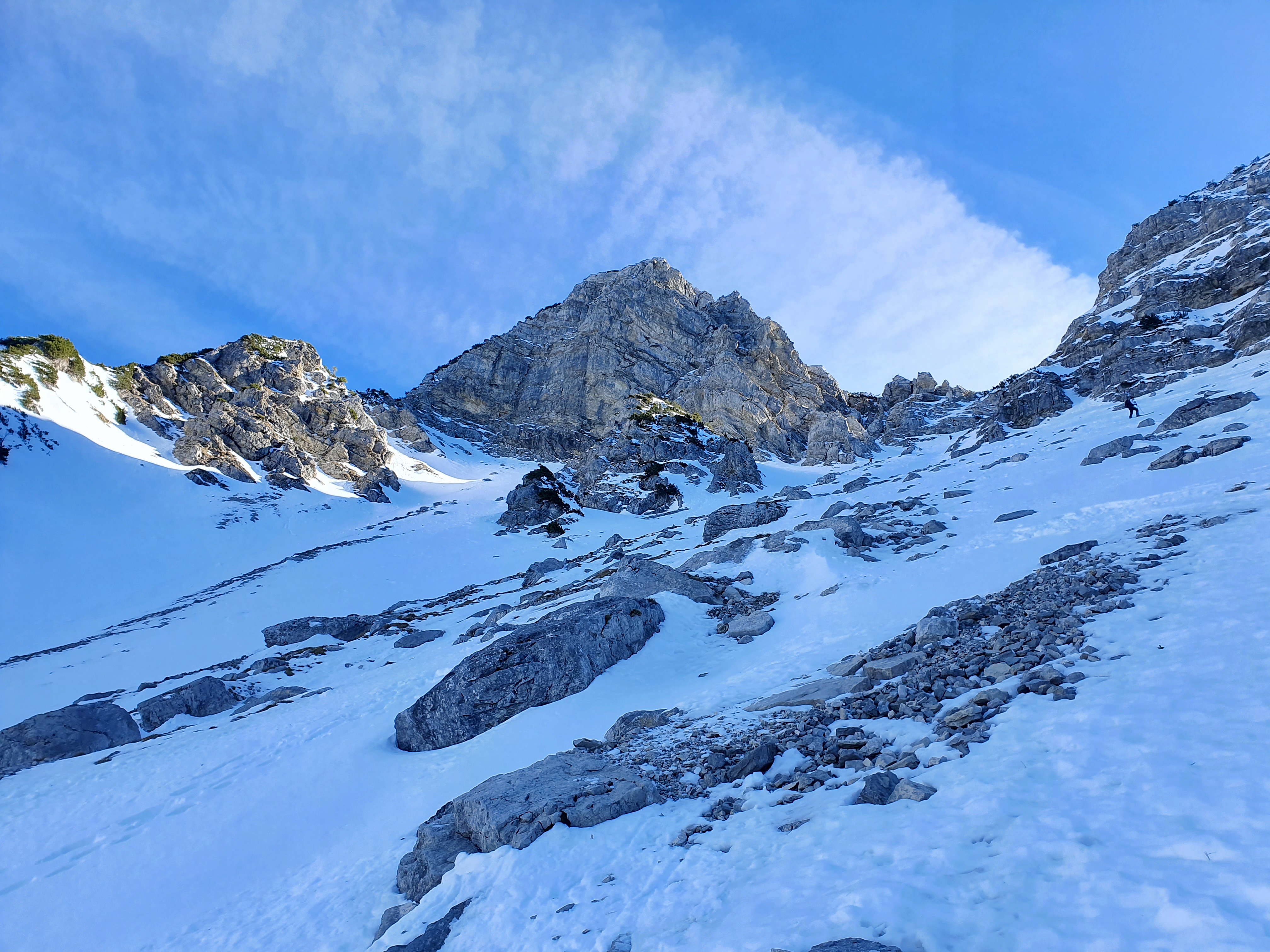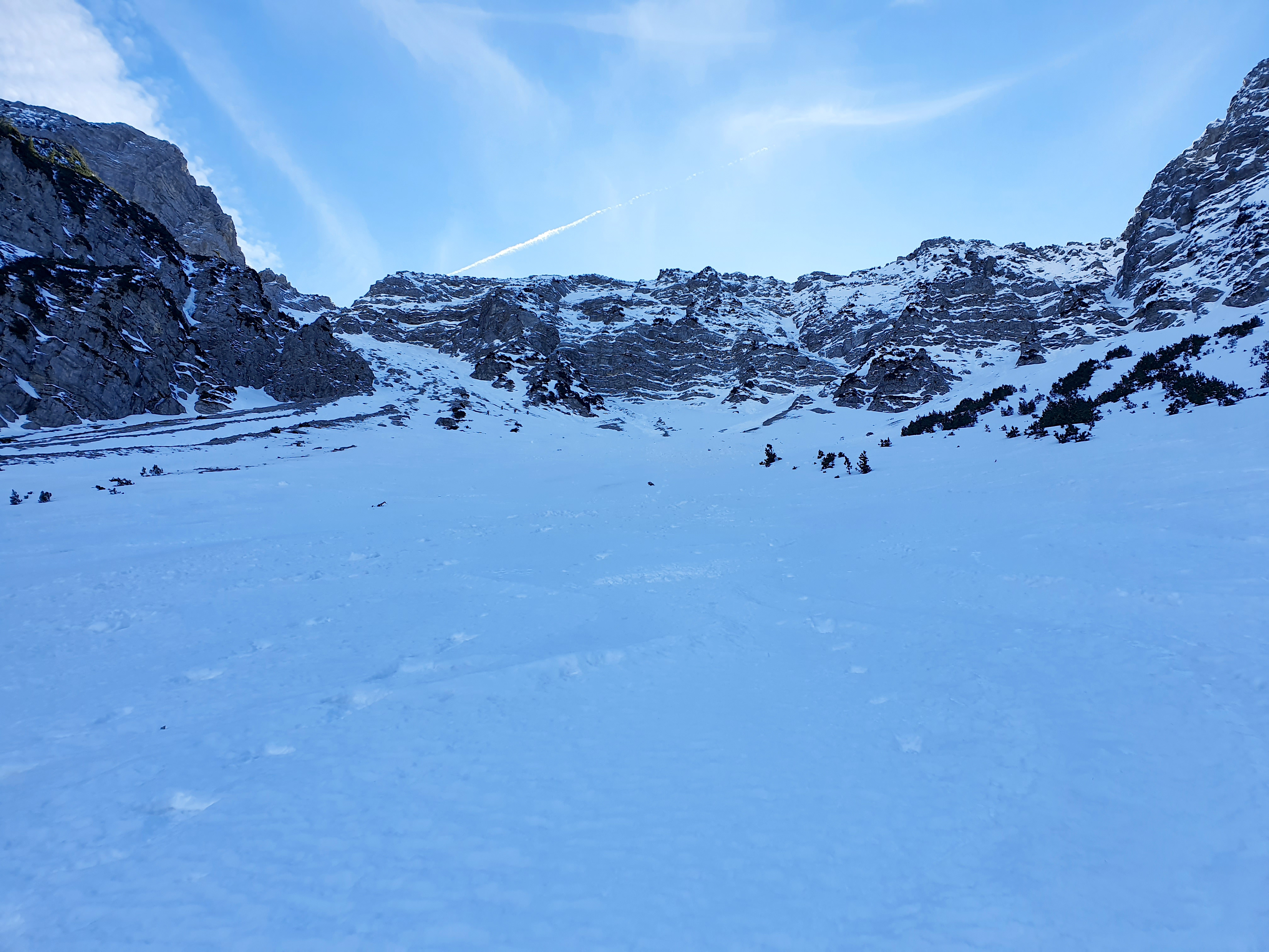 Tourenverhältnisse: sichere, trockene Verhältnisse durch den Wald, Aufstieg durch das Kistenkar mit Harscheisen, Ausstieg problemlos, Abfahrt auf harter Piste mit tlw. Harschdeckel