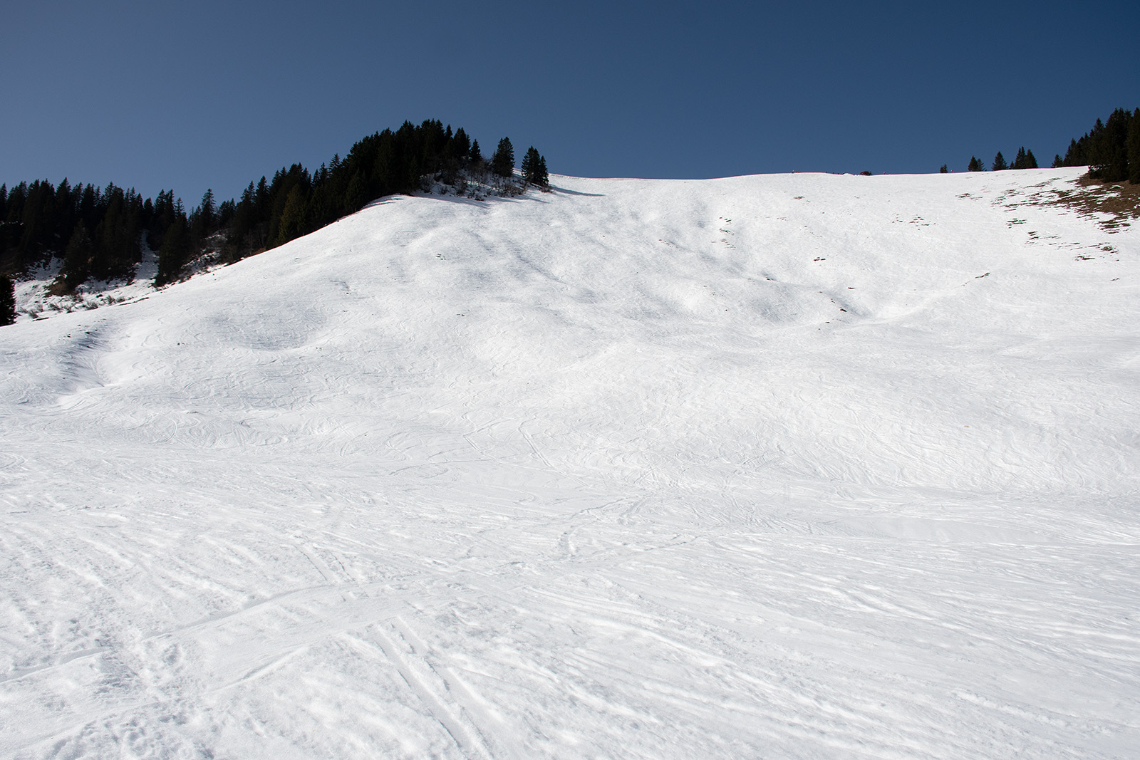 Grünseeabfahrt (12 Uhr), die Hänge top (aber bitte Gleitschnee-/Schneebrettgefahr im Gipfelhang nicht außer Acht lassen), die Pistenschneise unten aufgrund von Holz-/Erd-/Pisten-Arbeiten??? freigeräumt mit vielen Nadeln und Ästen, heute am Rand noch auf einem schmalen Schneeband mit einigen Seitenwechseln befahrbar, damit ist aber spätestens in 1-2 Tagen Schluss