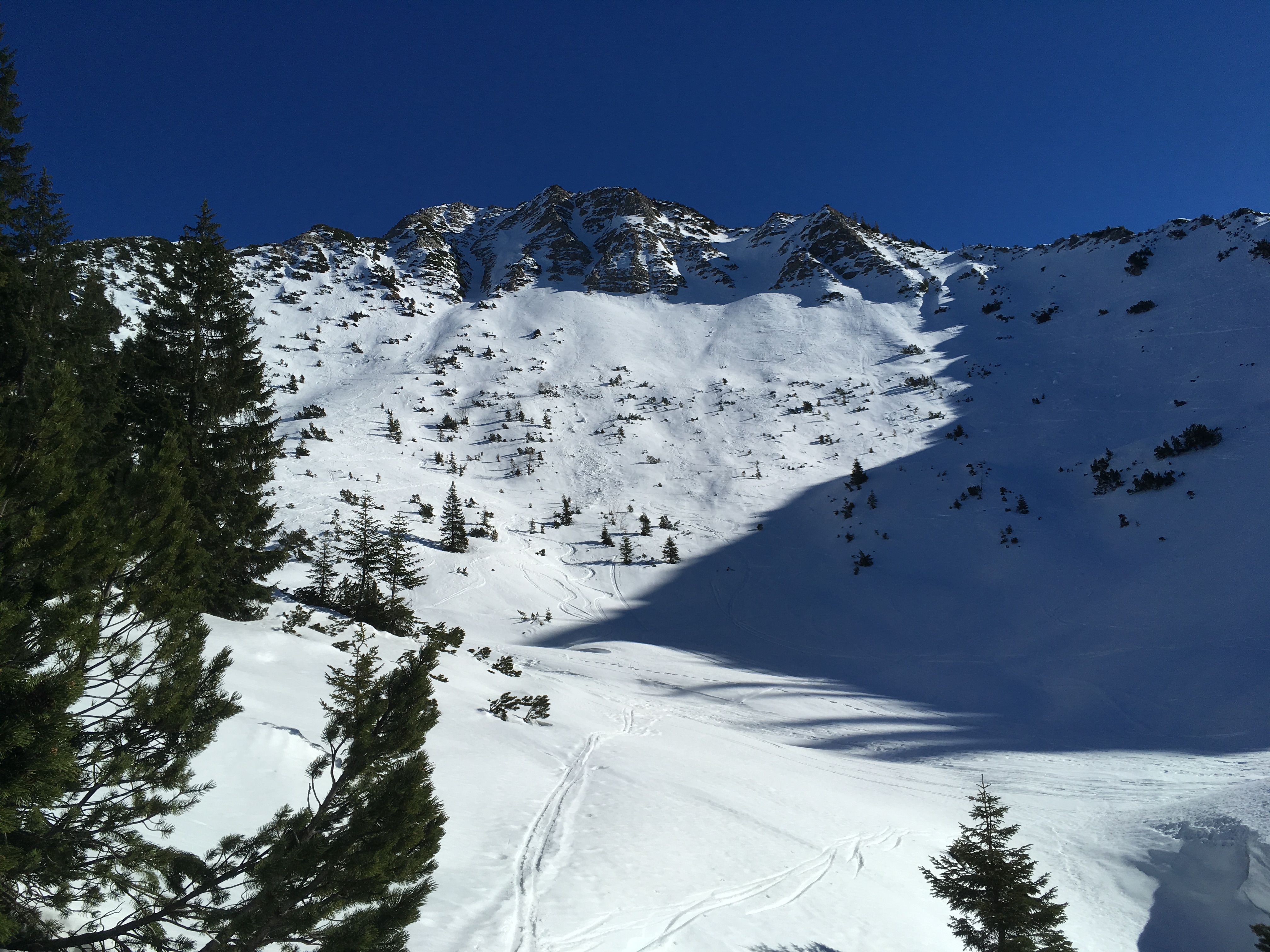 Gefahreneinschätzung: lawinentechnisch sind beide Anstiege und Abfahrten steil, Hauptgefahr dürfte aber zur Zeit die Abrutschgefahr sein bei dem Hartschnee (auch beim Weg oberhalb der Schlucht nach der Altenberger-Alpe)
