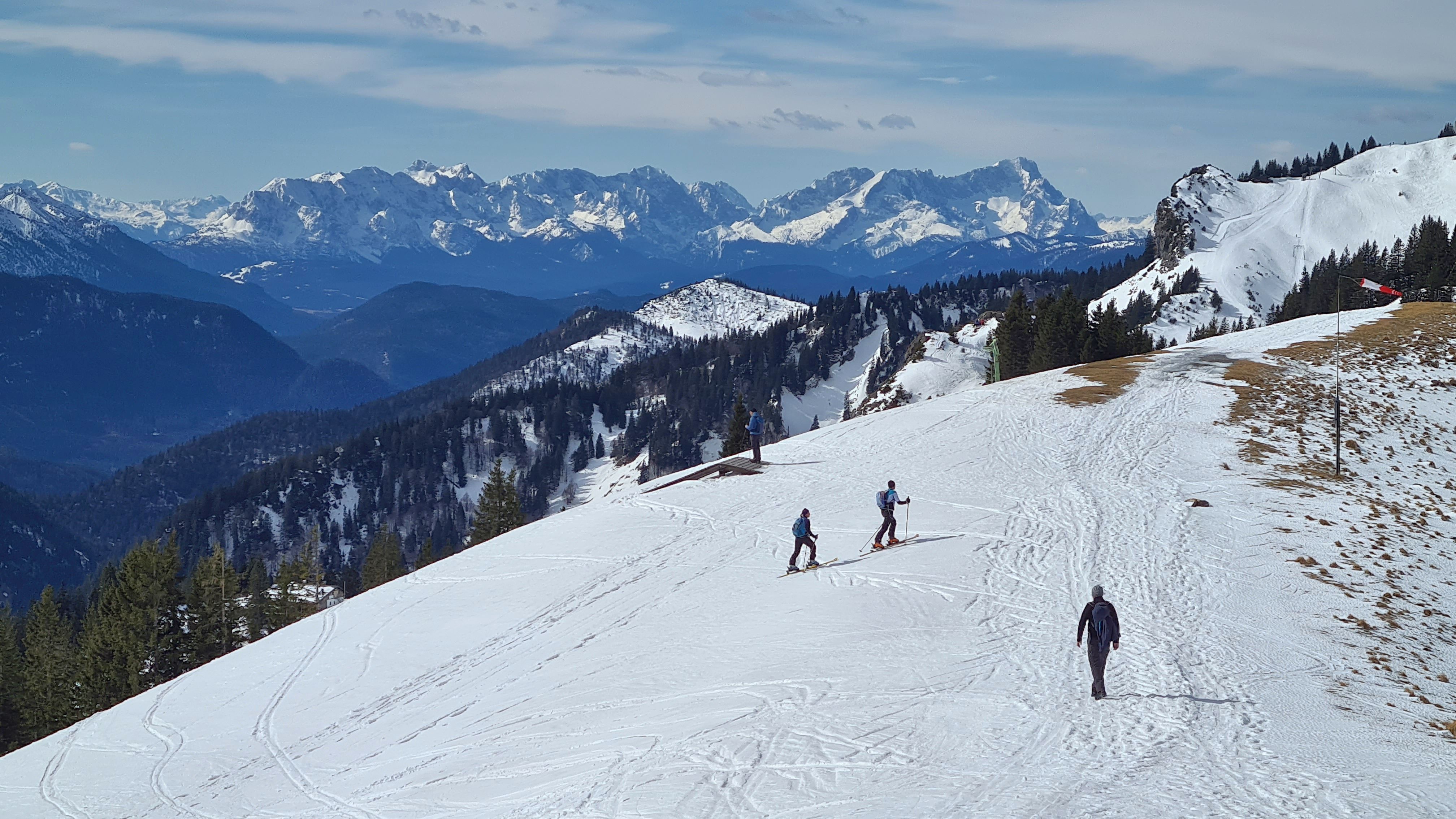 Den Streidlhang hoch (der Zielhang hat nicht mehr genügend Schnee) und über die Weltcupabfahrt hinauf. Die erste Steilstelle auf ca. 1000 m ging für mich noch ohne Harscheisen. Andere hatten die da schon dran. Auf 1060 m ist ein weiteres steiles Stück, das man aber bequem auf dem Wanderweg (ca. 5 m lange Tragestelle ohne Schnee) links herum umgehen kann.