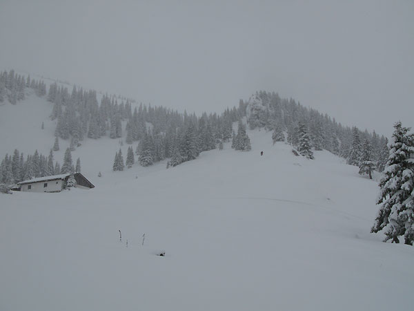 Die Abfahrt Richtung Krottentaler Alm hat im oberen Bereich noch nicht gut ausgeschaut, hier teilweise etwas abgeblasen und noch zu wenig Schnee. Der Gipfelhang der Aiplspitze sah dagegen schon gut aus.