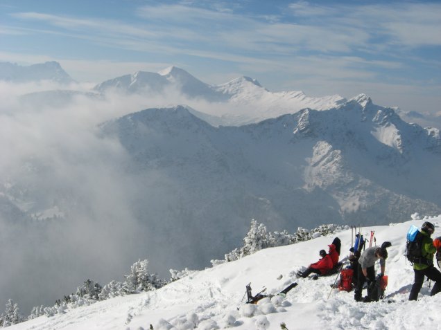 Abfahrt: Hang vom Gipfel zur Diensthütte durch die Latschen pistenmäßig eingefahren, dann kurz harschig und dann richtig pulvrig (auch die Schneise unterhalb der Diensthütte). Auch im Waldweg liegt genügend Schnee. Abfahrt zuletzt über den Forstweg via Tyrolerhütte zum Aufstiegsforstweg und über diesen zum Parkplatz.