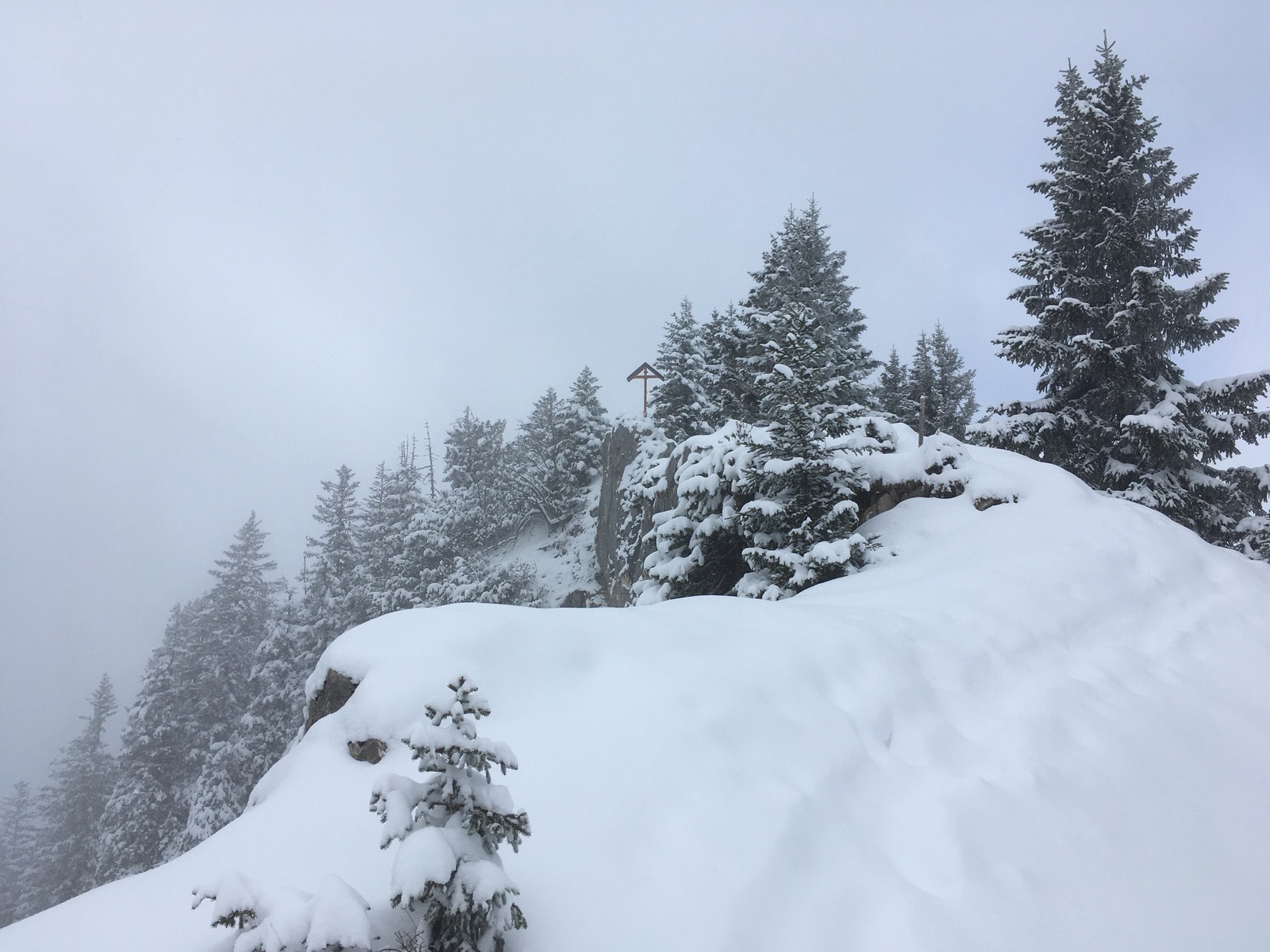 Angesichts des angekündigten schlechten Wetters wollte ich heute nur eine kleine Tour im geschlossenen Garmischer Skigebiet unternehmen: Vom Hausberg hoch zum Kreuzjoch. Aufstieg über die Hornpiste problemlos, Abfahrt oben toller Pulver, weiter unten auch guter Pulverschnee, aber man spürte insbesondere in den steileren Passagen doch die alten Spuren. Abfahrt über die Hornpiste ist aber nur bedingt zu empfehlen: Obwohl ich max. 5x Bodenkontakt hatte (apere Stellen vor dem Neuschnee, die man jetzt nicht gut sieht), habe ich mir ganz schöne Kratzer in den Belag eingefahren. Wahrscheinlich geht die flachere Dreh-Piste besser, außerdem dürfte da noch weitgehend eine Altschneedecke vorhanden gewesen sein.