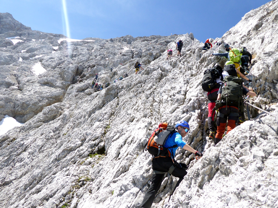 Und so gut wie heute (natürlich auch in den nächsten Tagen) sind die Verhältnisse nicht immer. Man kann sie getrost als optimal bezeichnen. Nach er erfrischenden Klamm um 7.45 Uhr ein Frühstücksradler (5,20 Euro) in der neuen Höllentalangerhütte, weiter zu Leiter un Brett (wo der Stau sich vor uns wie von Geisterhand aufgelöst hatte). Über den grünen Buckel zum Gletscher, der früh beginnt und eine gute, teils etwas steil angelete Stapfspur hat. Ich bin alles ohne Steigeisen/PIckel gegangen - wer sich unsicher fühlt, sollte nicht so spartanisch unterwegs sein. Die Randkluft: am oberen (linken) Einstieg perfekt einfach, die beiden Varianten rechts davon nicht erreichbar. 8 Minuten Stau an der Randkluft das war für solch einen Schönwettersamstag okay. Danach, im Klettersteig, gab es einige Bremser; u.a. einen Holländer, der zusätzlich zum Klettersteigset eine Steigklemme ins Drahtseil einhängte und eeeewig brauchte. Da half nur beherztes und ungesichertes Überholen - nach sechseinhalb Stunden Aufstieg war der Gipfel erreicht, ohne die Stockungen wäre es schneller gegangen.