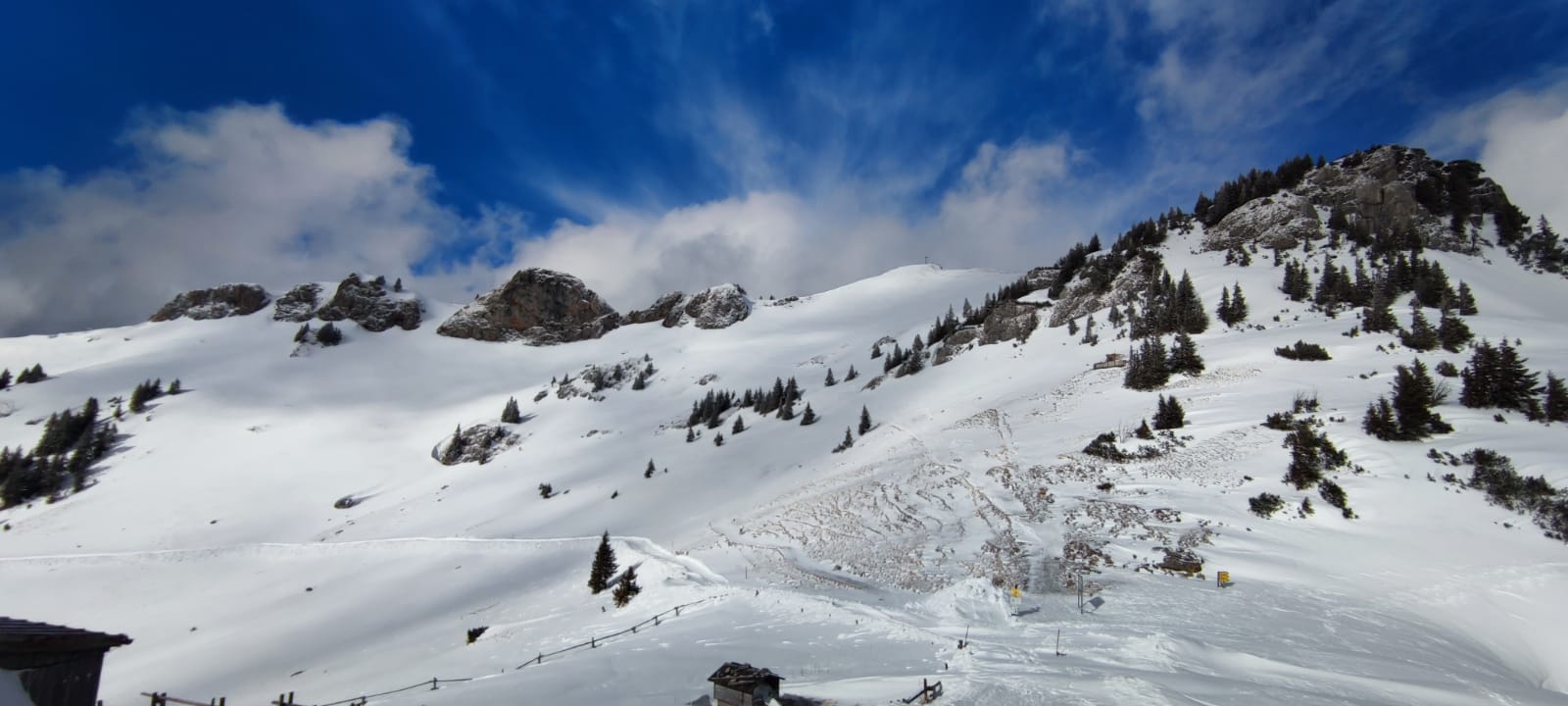 Wo unter anderem der abgeblasene Schnee ist, habe ich dann gesehen als ich einen Blick auf die ostseitige steile Abfahrt vom Rotwandhaus blickte... gestern geschätzt 2-3 Meter hohe Wechte (vgl. Bild, da schwer einzufangen). Ich bin selbst gewiss kein Lawinenexperte, mir hat es definitiv nicht gefallen und persönlich als erhebliche Gefahr beurteilt. Zwei andere Tourengängerinnen kamen auf eine ähnliche Einschätzung. Spur war eine ganz am Rand zu erahnen.