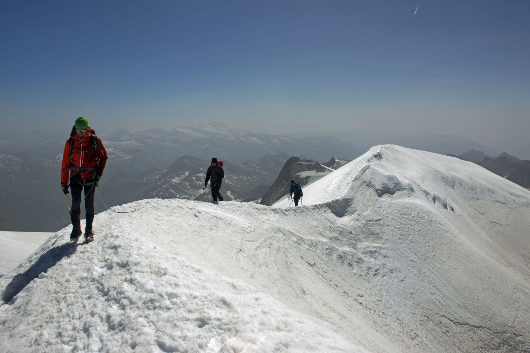 Im obersten Teil kommt wiederum langsam Blankeis heraus. Der tolle und etwas exponierte Gipfel-Firngrat hat aber guten Trittschnee, was angesichts starker Windböen auch gut war. Der Wind sorgte zudem dafür, dass der (schon am Morgen weiche) Schnee trotz der hohen Temperaturen nicht noch weicher wurde und man somit im Abstieg man nicht tiefer einsank.