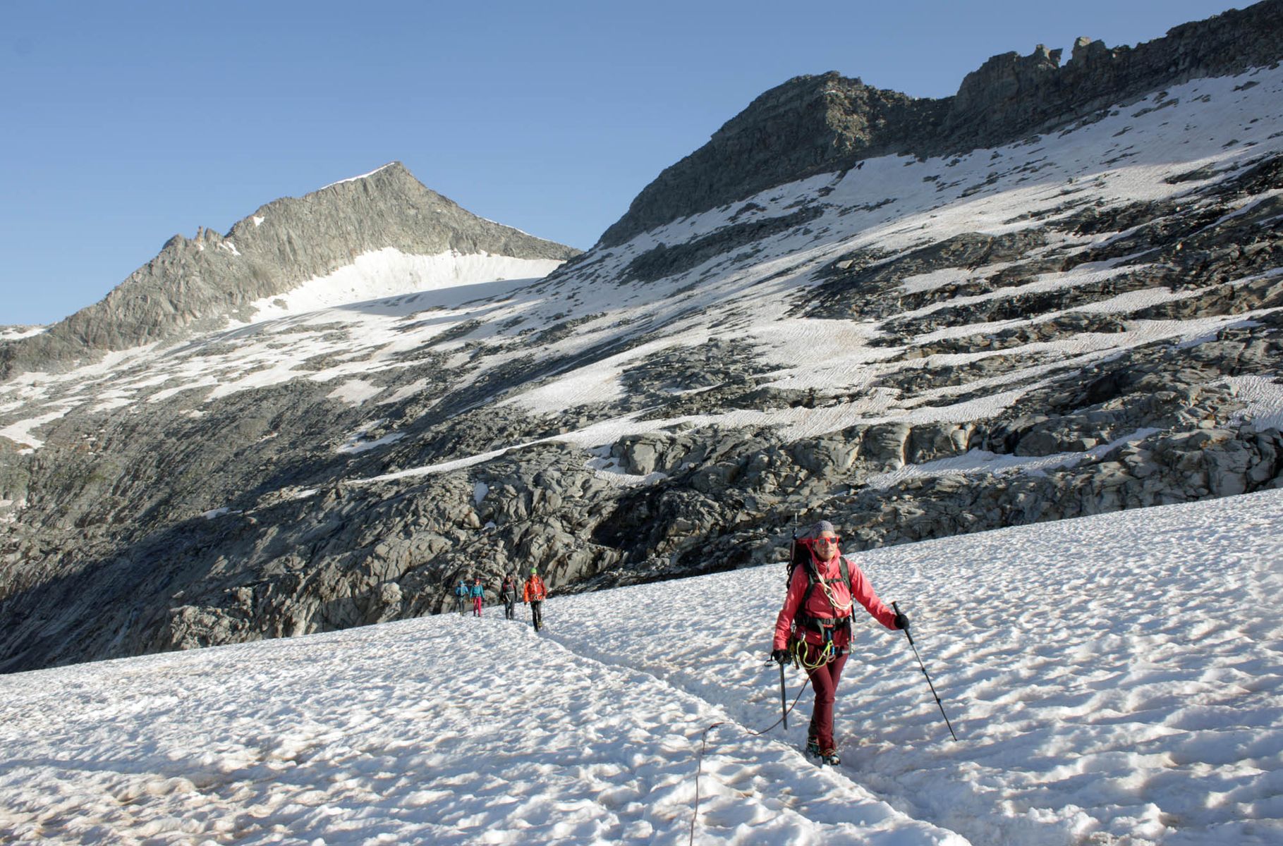 Die Spaltensituation auf dem Obersulzbachkees ist noch vergleichsweise gut. Es ist noch eine recht kompakte Altschneeschicht vorhanden. Die meisten Spalten sind noch geschlossen, werden sich aber je nach Witterung in den kommenden Wochen auch hier öffnen.