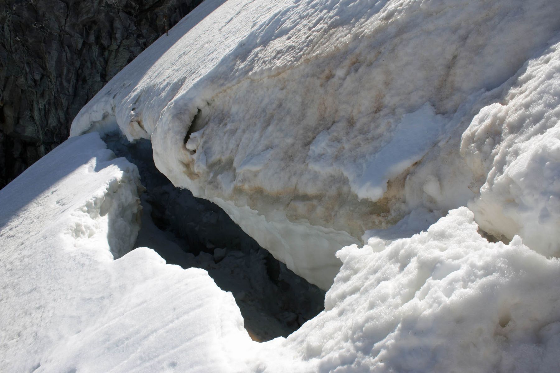 Das gilt jetzt schon für den teils aufgerissenen Bergschrund. Noch führt eine tragende Schneebrücke über die tiefe Spalte. Wie lange sie aber noch hält ist fraglich. Deswegen wird dort wie üblich eine Stahleiter platziert werden.