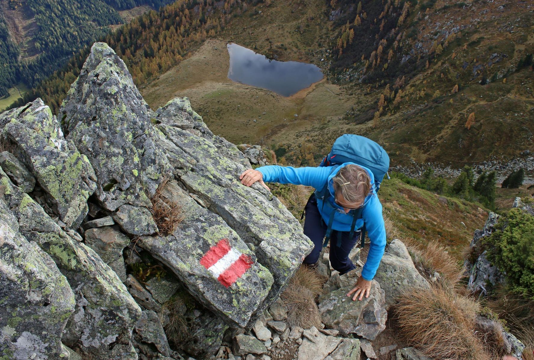 Die Anstiege waren alle schneefrei und (trotz der Regenfälle an den Vormittagen) erstaunlich wenig rutschig. Das gilt auch für den steilen Aufstieg zum Schober (2133 m), wo man auf den letzten Metern durchaus auch mal Hand an den rauen Fels legen darf.