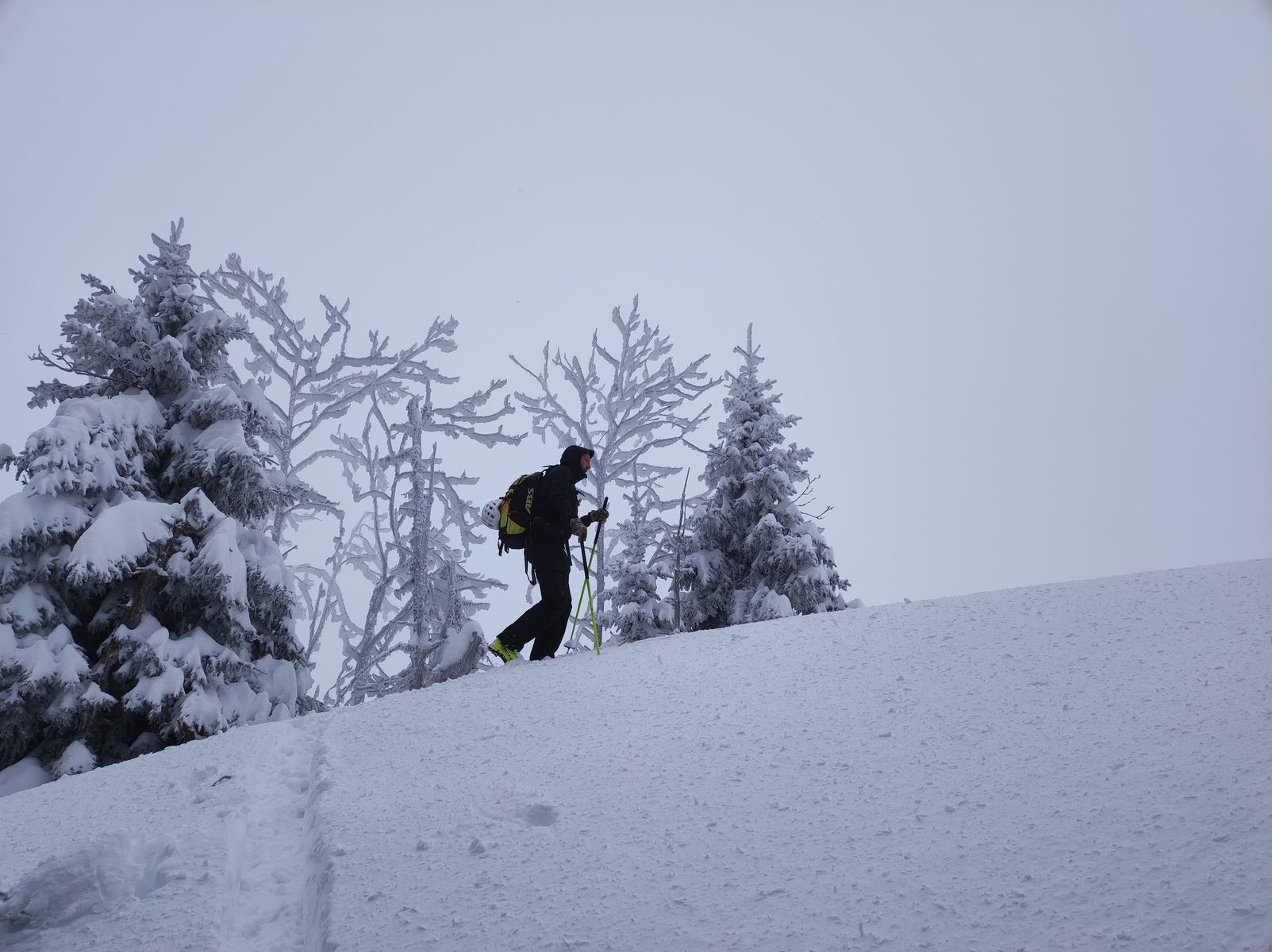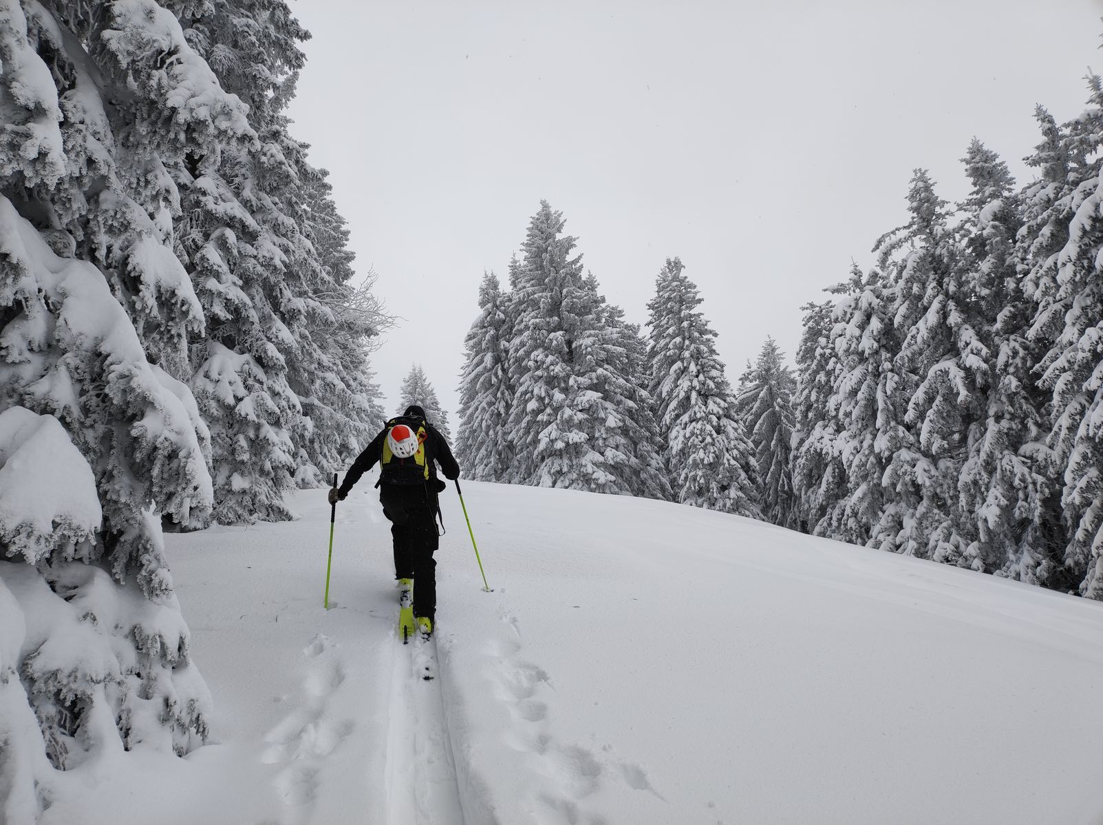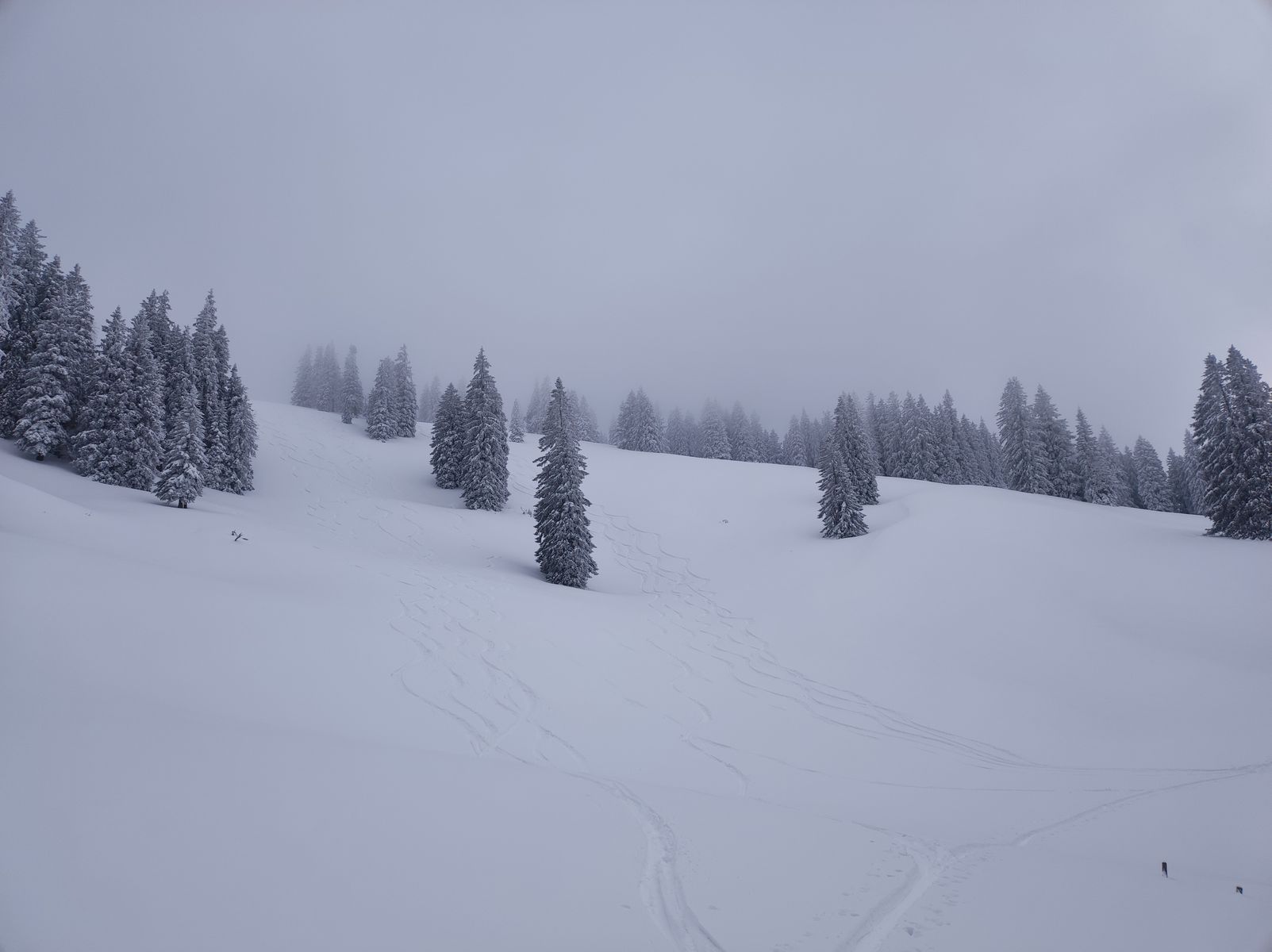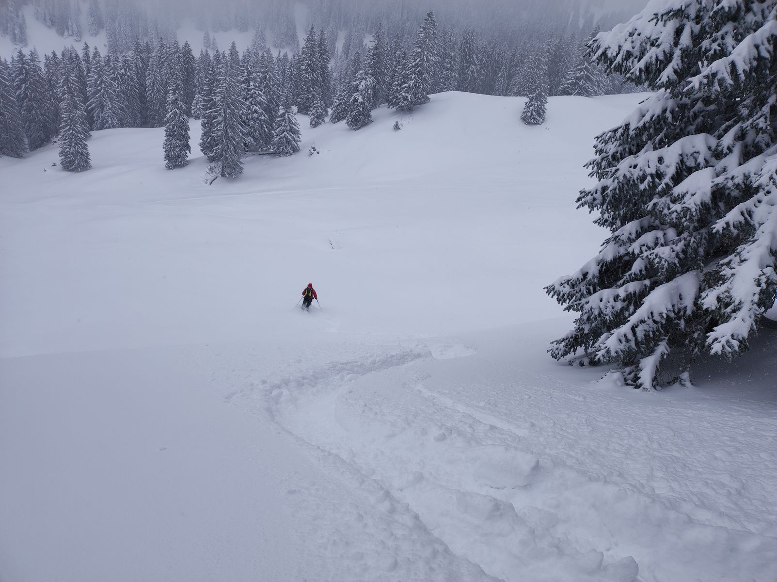 Los war gar nichts, vielleicht noch drei oder vier Kollegen im Gebiet unterwegs. Auch gestern war wohl wenig Betrieb. Ab den Laubenstein-Almen waren die Spuren von gestern schon wieder völlig zugeweht, sodass wir oben fast alles selbst gespurt haben. Das Wetter war ganztags bedeckt und nebelig mit leichtem Schneefall - aufgrund des waldigen Geländes aber dennoch meist gute Sicht.