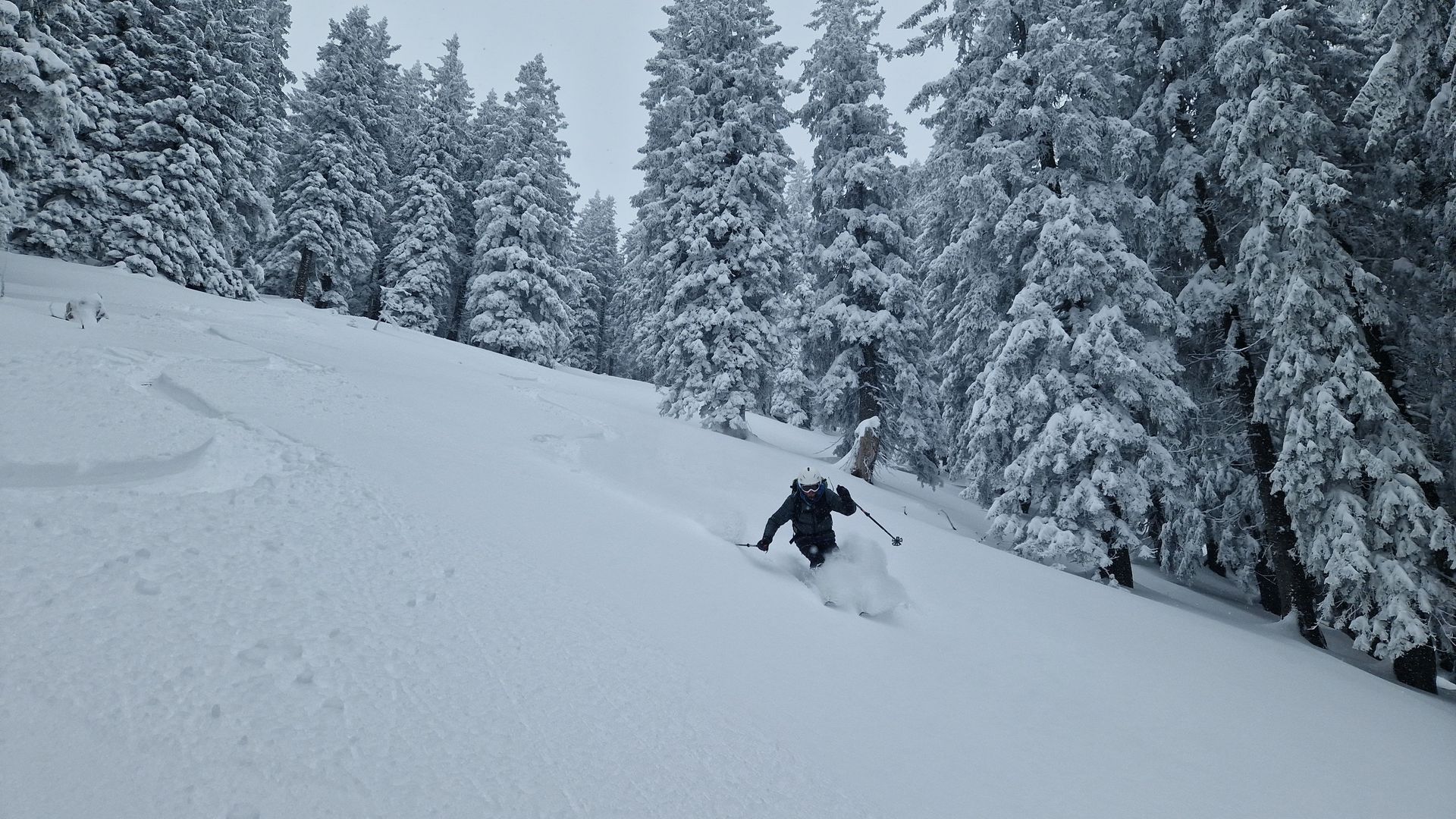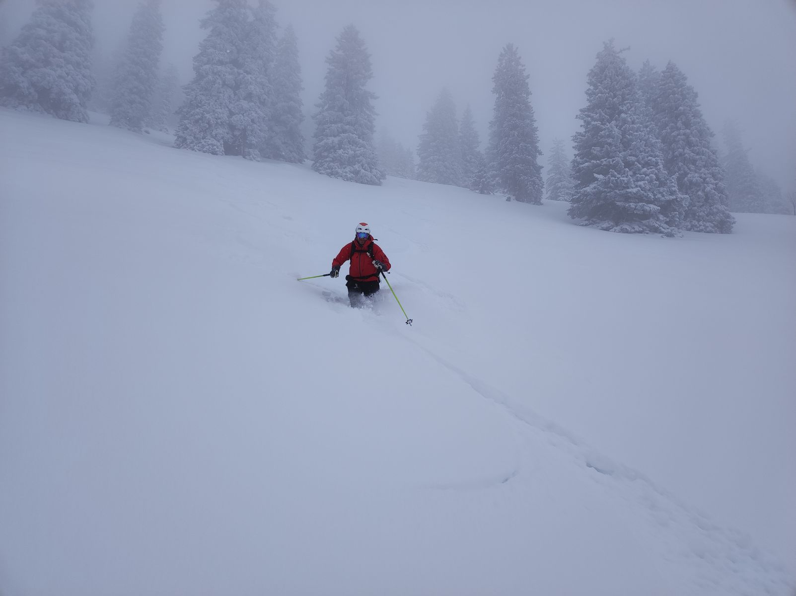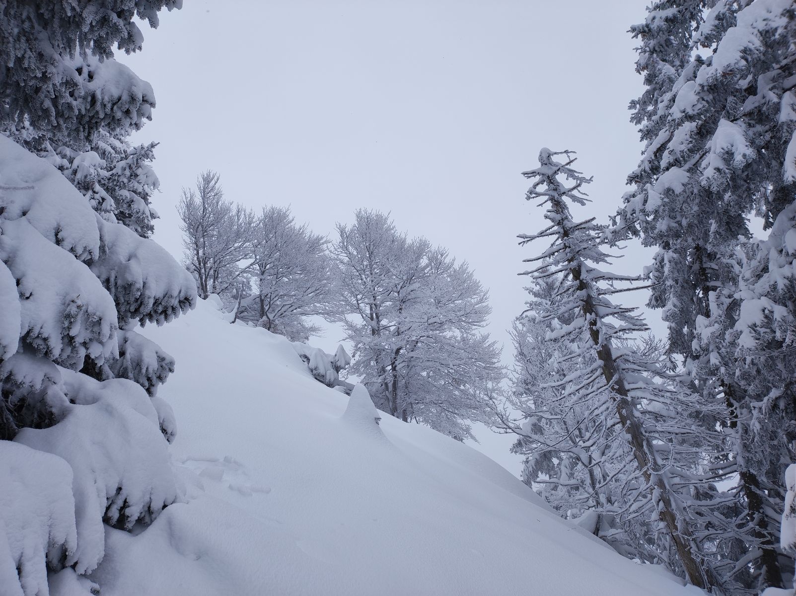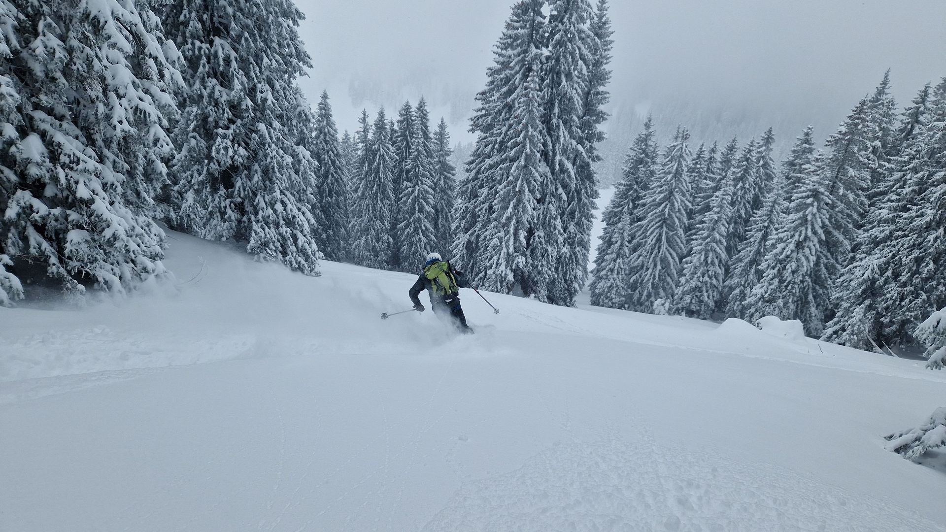 Los war gar nichts, vielleicht noch drei oder vier Kollegen im Gebiet unterwegs. Auch gestern war wohl wenig Betrieb. Ab den Laubenstein-Almen waren die Spuren von gestern schon wieder völlig zugeweht, sodass wir oben fast alles selbst gespurt haben. Das Wetter war ganztags bedeckt und nebelig mit leichtem Schneefall - aufgrund des waldigen Geländes aber dennoch meist gute Sicht.