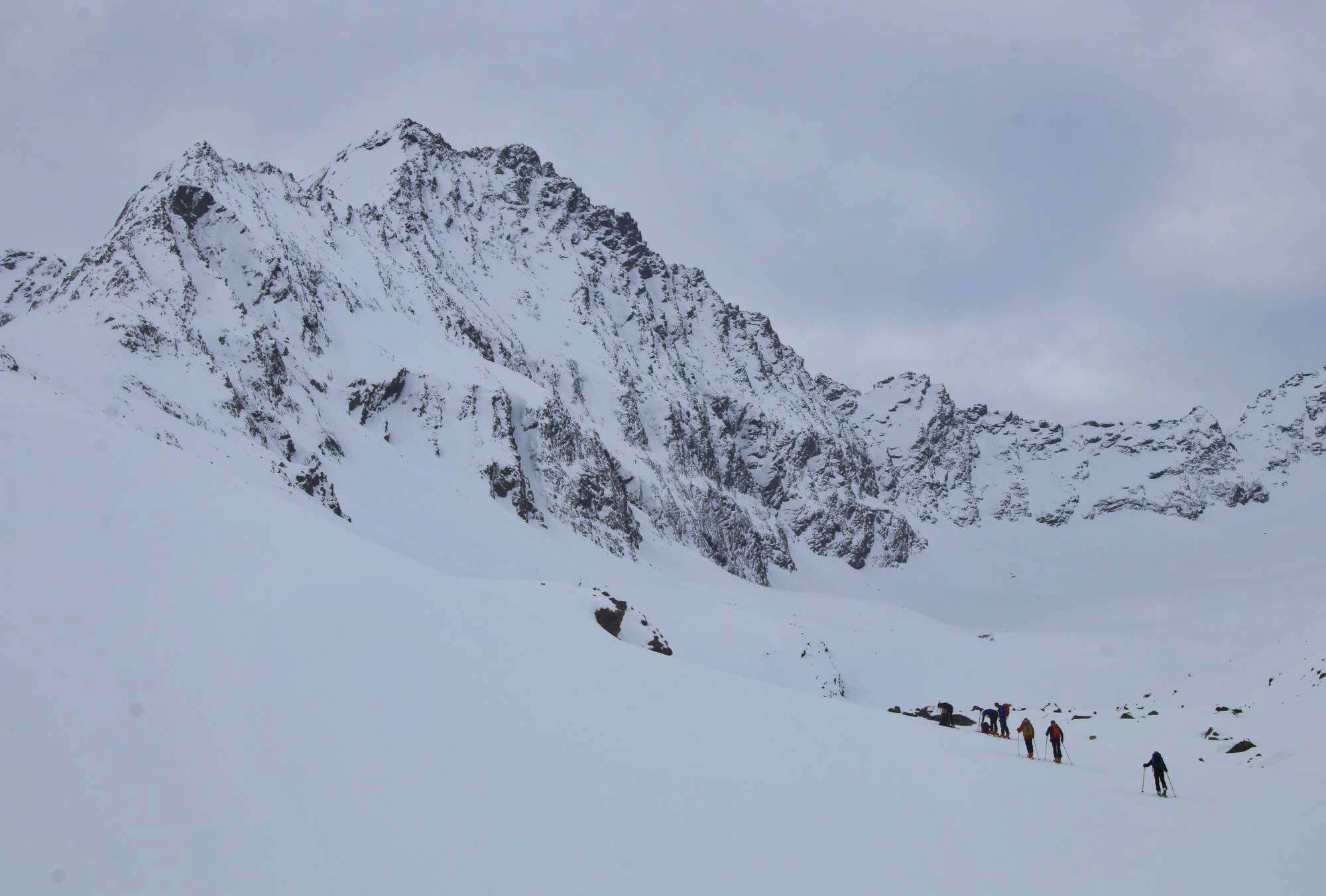 Von der Pforzheimer Hütte ging es am nächsten morgen zunächst in abfahrender Querung ins Gleirschtal und auf der anderen Seite zum Zischgenferner. (Erst fester Harschdeckel, dann gesetzter Pulverschnee). Wir stiegen zum Schluss (wie meist üblich) nicht über die Gipfelflanke, sondern über den links davon liegenden Gipfelgrat auf (bis 43° steil, kurze Kletterstelle). Es liegt derzeit ausreichend Schnee. Ich konnte bis St. Sigmund abfahren.