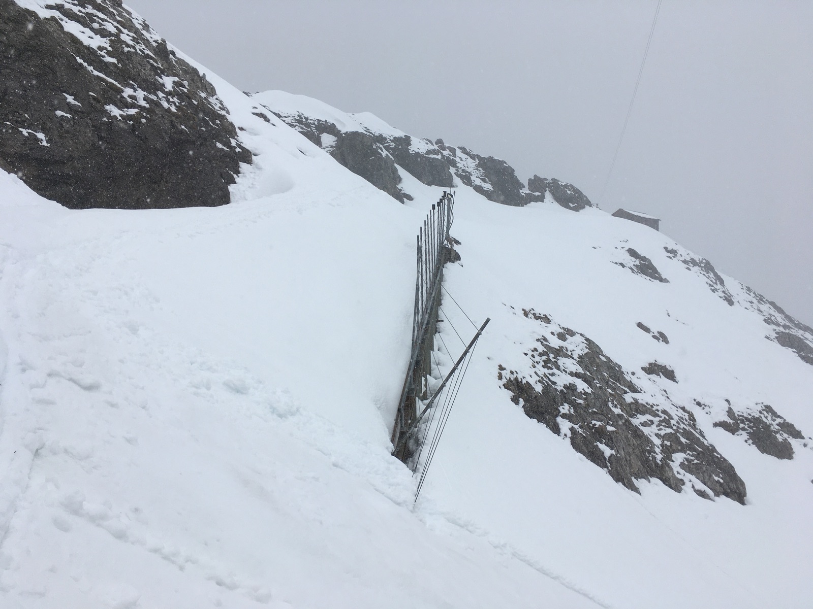 Der Hang von der Bergwachthütte Richtung Dammkarhütte (oben der Schotter ist abgeräumt von den Lawinen):