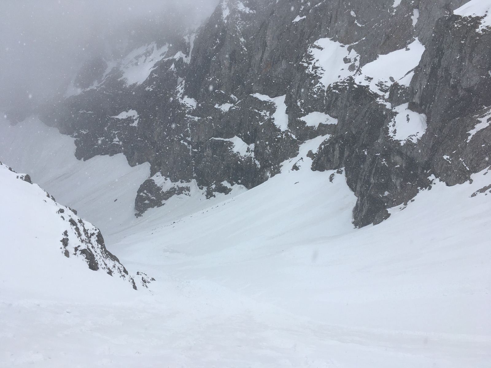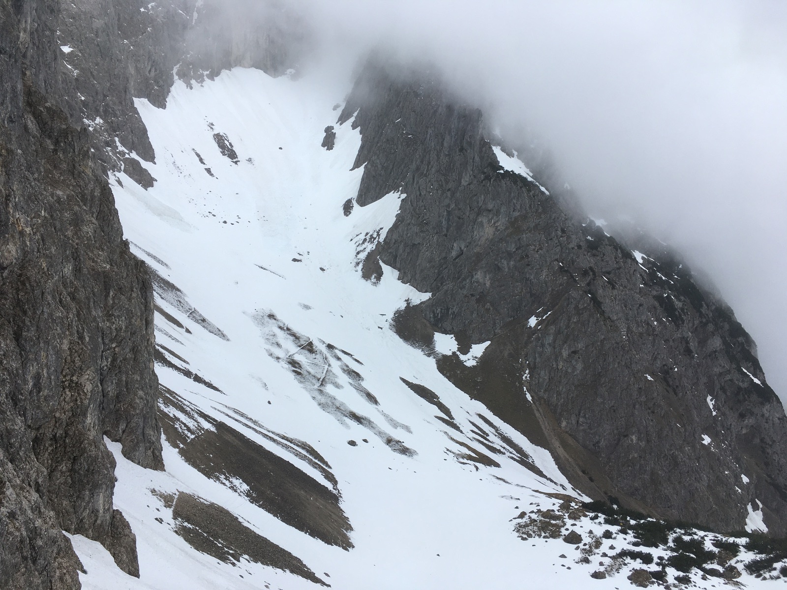 Die Abfahrt bot oben nassen Neuschnee, im Mittelteil dank Steilheit passabel und ab der Bergwachthütte geht es Richtung Sommerschnee. Mit drei kurzen Unterbrechungen ging es dann im Kanonenrohr noch bis ca. 1.550 m hinab. Ganz unten konnte auch noch ein Schneefeld abgefahren werden. Insgesamt wird es im Kanonenrohr aber wohl bald vorbei sein. Vorderes Dammkar geht auch noch. Ab ca. 1.800 m liegt noch ordentlich Schnee - typisch für diesen merkwürdigen Winter: Bis in mittlere Lagen wenig Schnee, ab den hohen Lagen aber gut Schnee. Aus den Flanken sind schon viele große Lawinen abgegangen, es ist aber noch nicht alles unten (der Grund, warum ich dieses Jahr lange zugewartet habe mit der Tour). Von Wandertouren im Gebiet (in dieser Höhenlage und Exposition) rate ich derzeit noch dringend ab.
