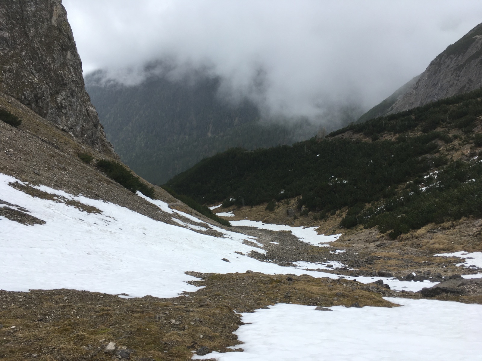 Heute sollte das angekündigte Wetterfenster am Vormittag für die alljährliche Skitour ins Dammkar genutzt werden. Zu Fuß bis zum "Bankerl" und dann gleich weiter, weil im "Kanonenrohr" dieses Jahr nur noch wenig Schnee liegt (Regen und Wärme haben da volle Arbeit geleistet). An der (geöffneten) Dammkarhütte kamen die Kurzski dann aber an die Füße. Heute leider zunächst dichter Nebel, aber wirklich verlaufen kann man sich da ja nicht und außerdem kenne ich mich gut aus. Hoch durch das Hintere Dammkar bis zum Tunnelausgang. Dieser war (entgegen des Schildes) geöffnet. Genau als ich oben ankam, wurde das bis dahin noch trockene Wetter aber so richtig garstig mit Graupelschauer und da es nur noch schlechter werden sollte und man oben ohnehin wenig sah und tiefen Schnee hatte, entschied ich mich gegen eine Besteigung von Östlicher Karwendelspitze oder Nördlicher Linderspitze.