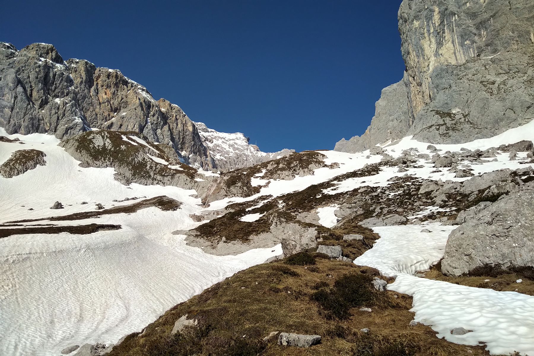 Bis zum Brett ist der Steig momentan schneefrei, die Randkluft ist zur Zeit in einem guten Zustand (wie oft im Frühsommer). Aber weiter oben (vor allem zwischen 2700-2800) ist es nicht ohne. Die eigentliche Saison auf dieser Tour geht normalerweise erst in ein paar Wochen los.