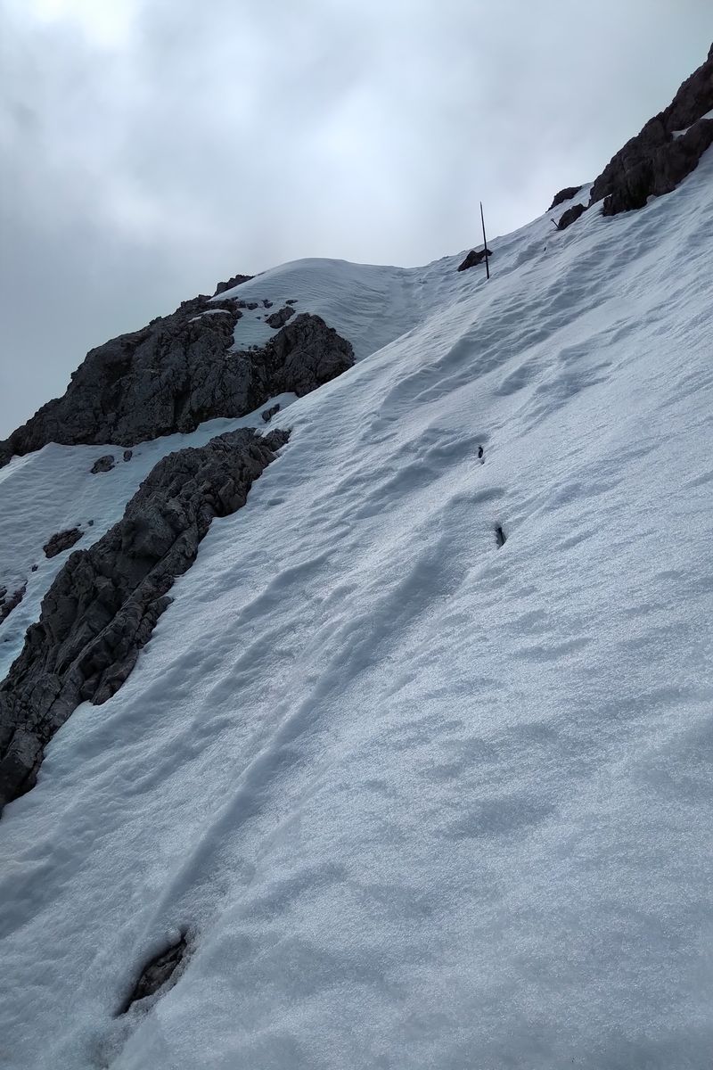 Die anderen waren bis zum Gletscher hinter mir und sind dann umgedreht. Man muss schon sagen, dass man momentan Schnee-technisch schon genug Erfahrung mitbringen sollte (entweder vom Skibergsteigen oder Hochtouren). Oben gibt es längere Passagen, bei denen das Drahtseil unter dem Schnee verschwindet und man sich auf steiles Schneegestapfe einstellen muss (immerhin kaum Eis). Die Hauptspur weicht momentan auf ca. 2700 nach rechts zum Grat ab und kommt später wieder zur Normalroute dazu (kurz vor der Irmerscharte). Zu dem Zeitpunkt sah es mir sicherer aus, dem Knick nachzugehen, als eine eigene Spur entlang der Normalroute anzulegen, die das steile Schneefeld quert.