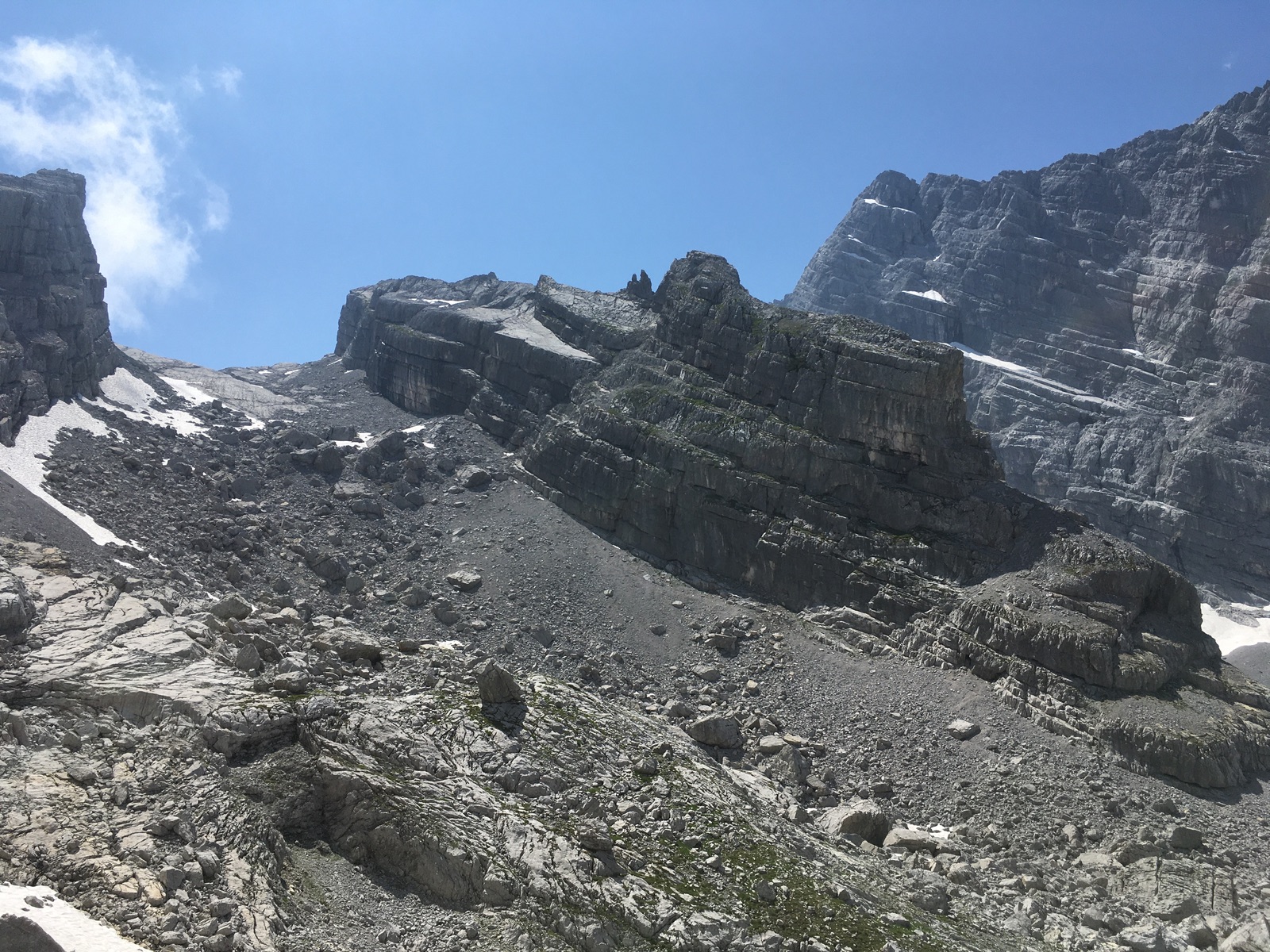 Die Felsstufe unter der Watzmannscharte von unten aus betrachtet: