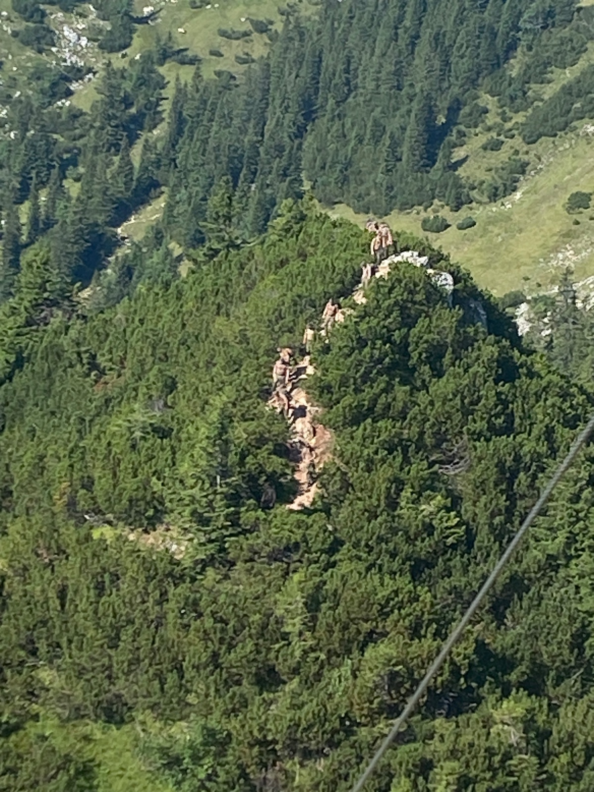 Vor diesem Hintergrund lautete der Plan heute: früh in die Berge und dann was eher Kurzes. Mit meiner Frau machte ich die Runde aufs Wildalpjoch vom Sudelfeld aus. Aufstieg via Schweinsteiger Alm und Wildalm auf dem eher selten begangenen Heidi-Weg hinauf zum Sattel östlich der Käserwand. Unter dieser entlang, vorbei an allerlei eingebohrten Sportkletterrouten. Am Gipfel erhielten wir Besuch von einem größeren Bundeswehrtrupp. Abstieg dann hinunter zum Seewandköpfl und weiter zu den Almen beim Lacherkar. Pünktlich um 12 Uhr waren wir wieder am Sudelfeld - erste Schäfchenwolken deuteten den obligatorischen Nachmittagsregen an…