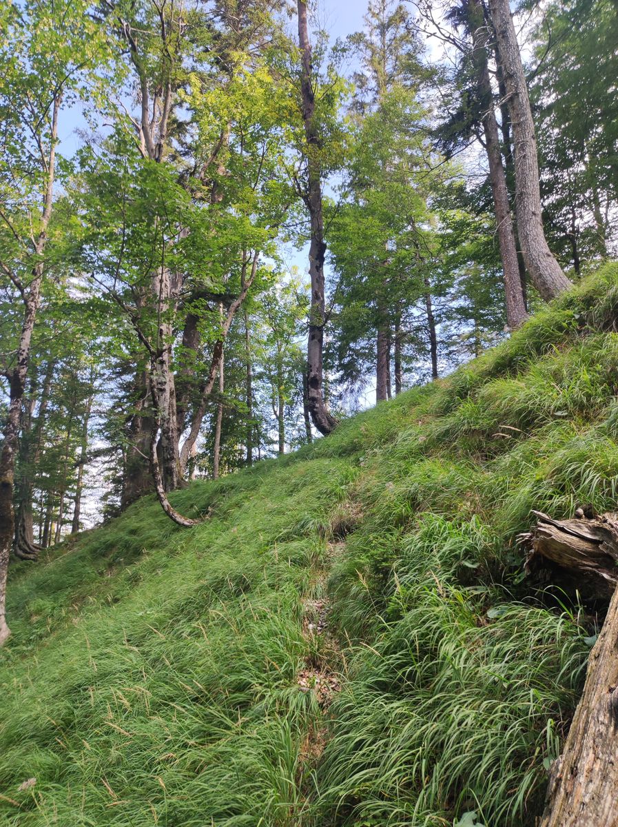 Nun eine etwas ausführlichere Beschreibung der Route: Vom PP in Bayerwald ein Stück an der Straße zurück und bei der Trifthütte über die Weißach, wo unmittelbar die Fortstraße zur Bodigbergalm ansetzt. Auf dieser geht es einige Zeit dahin, bis in einer auffälligen 180 Grad (nicht 360, Frau Baerbock) Rechtskurve links ein Steig (unbeschildert, nicht markiert) abzweigt. Dieser gabelt sich nach wenigen Metern: hier rechts bergauf. Durch wunderschönen Wald geht es auf guten Steig nach oben, bis der Weiterweg nach einer Bachquerung nicht gleich offensichtlich ist, da verschiedene Trittspuren vorhanden sind. Wenn sich nicht nach spätestens 20 Metern wieder ein deutlicher Pfad einstellt, ist man falsch. Wenig später verliert sich der Pfad für kurze Zeit ganz (in einem faszinierenden Urwald - dazu später mehr). Hier einfach flach zum nächsten Bachgraben gehen - auf der anderen Seite ist der Pfad wieder deutlich. Nun kommt von der Orientierung her das Schwierigste: Bliebe man auf dem Steig, kommt man bei der Königsalm heraus. Allerdings kann man auch völlig weg- und spurlos zum Platteneck aufsteigen. Hierzu auf ca 1300 Metern vor einem Bachgraben (der Weiterweg auf dem Steig verlöre hier markant an Höhe) zunächst über einen steilen Hang, später über einen schönen Höhenrücken nach oben. Bei Erreichen der Latschenzone lasse man sich etwas Zeit, um eine sachte Trittspur zu finden, welche die einzige Möglichkeit ist, um durch die Latschen zu kommen. Den Kamm erreicht man schließlich etwas oberhalb der Plattenalmen. Der Weiterweg zum Reitstein ist nicht durchgängig zu erkennen, aber man kann sich gut an den Grenzsteinen orientieren. Vom Reitstein geht es über die Bodigbergalm wieder ins Tal hinunter, wobei man ein Gumpenbad nicht versäumen sollte.