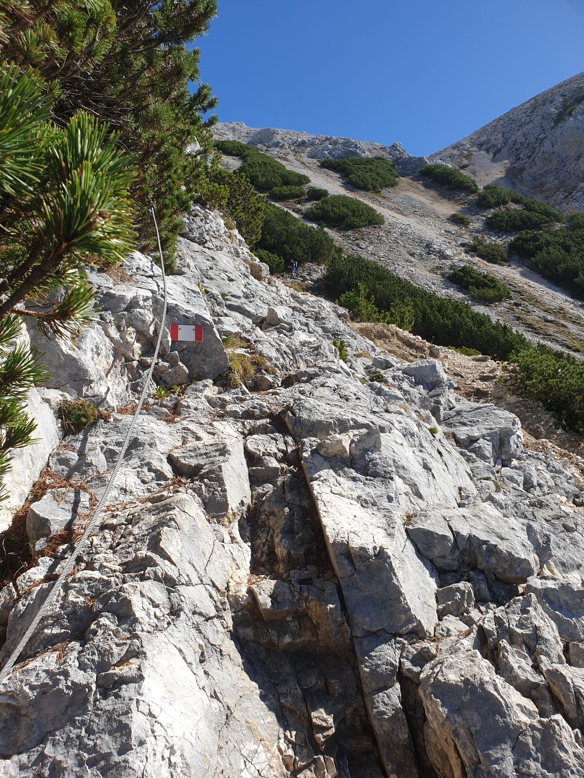 Übrigens: Es heißt ja in der Beschreibung: "über eine 3 Meter lange schmale Stelle im Kar hilft luxuriöser Weise sogar ein Drahtseil hinweg". Hier möchte ich anmerken, dass es neben ein paar sehr kurzen, aber unangenehmen sandigen, leicht abschüssigen Stellen insgesamt ca. 5 Seilversicherungen gibt (wobei man an den meisten Stellen besser an den Fels greif als ans Seil...) Auch davor muss man öfter über Schrofen klettern. Ich würde es ähnlich wie den Kramer einstufen, der jedoch Schwierigkeit "3" hat. Allerdings haben die Touren mit Schwierigkeit "2" generell eine recht große Bandbreite an Schwierigkeitsgrad.