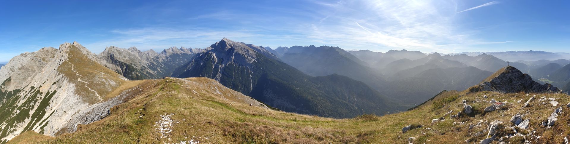 Gipfelpanorama Rotwandlspitze aus: links der Mittenwalder Höhenweg, rechts die Brunnsteinspitze (für volle Panorama anklicken)
