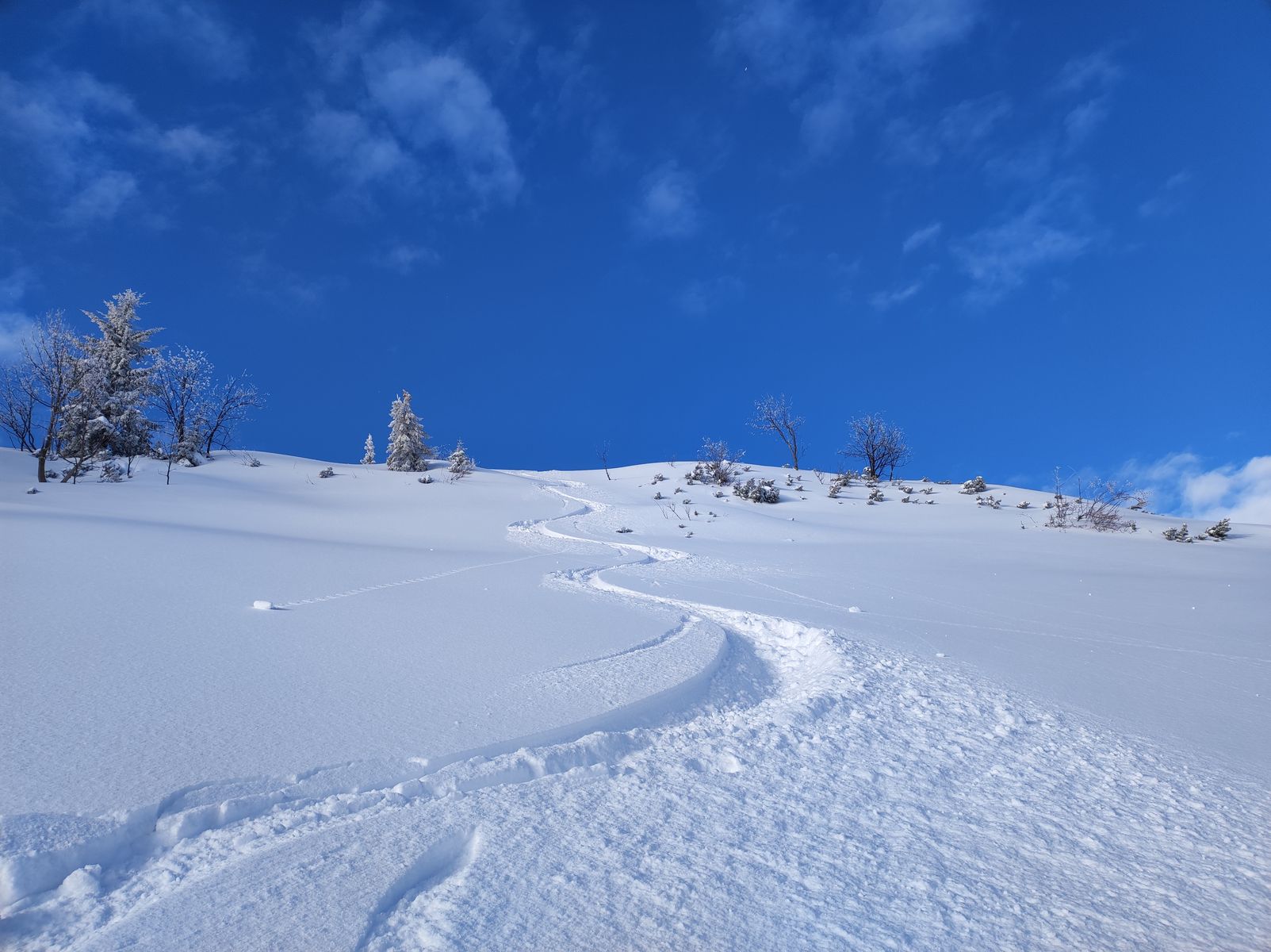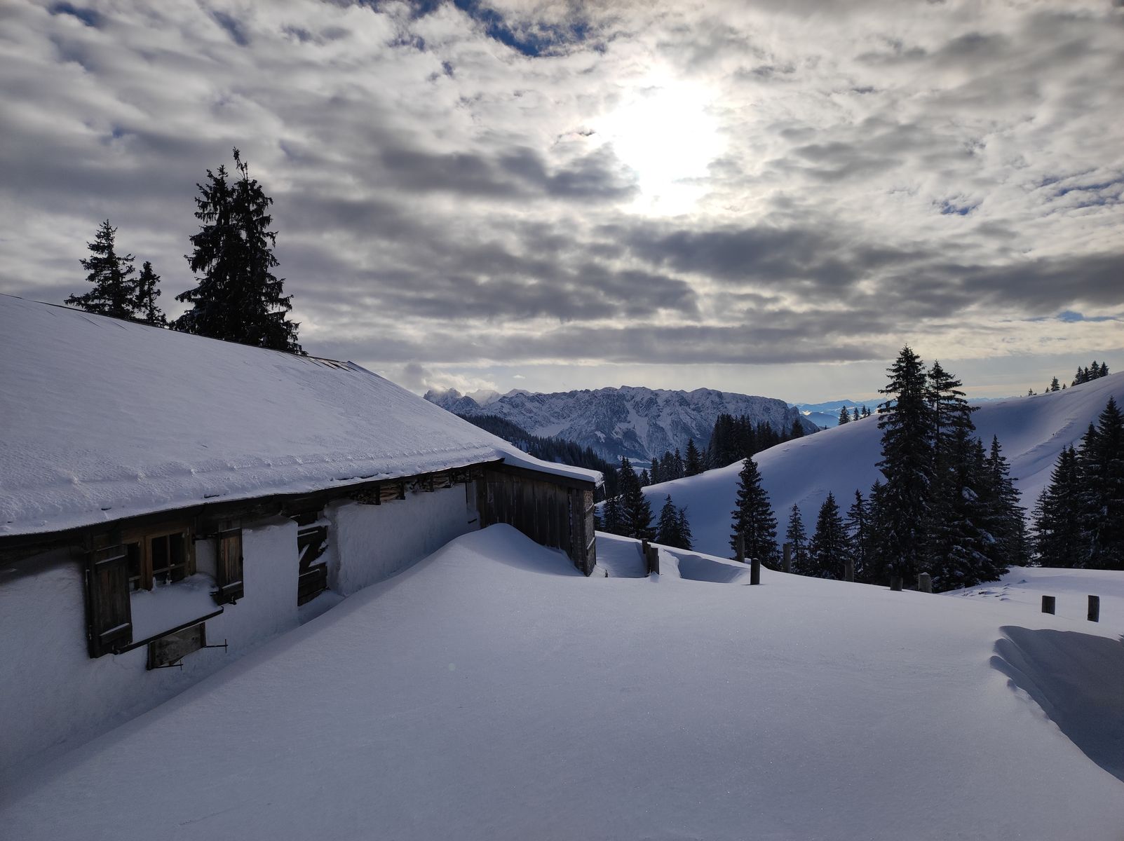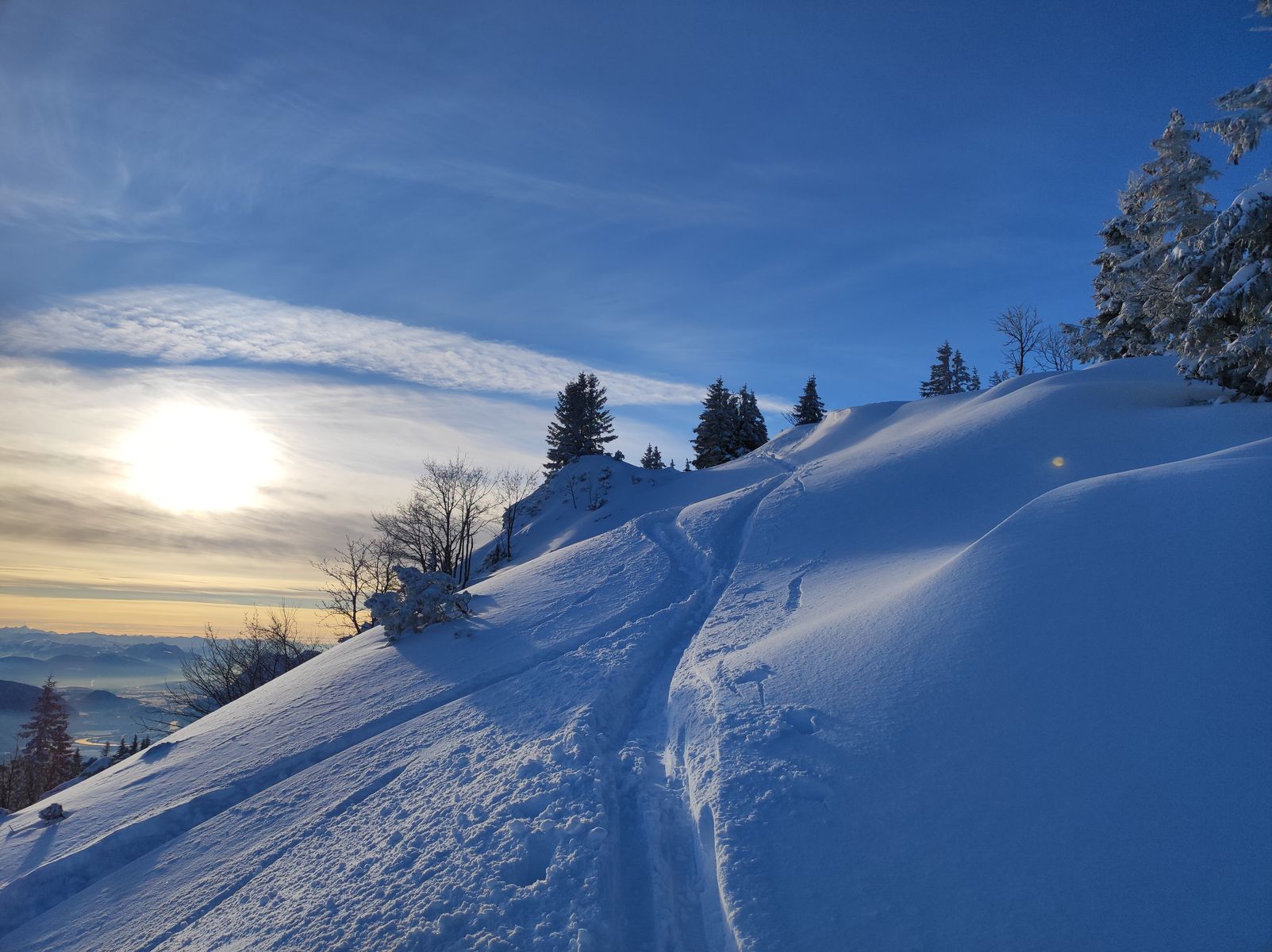 Da sich nun (13 Uhr) langsam Kaiserwetter einstellte, war ich motiviert, noch ein paar Pulverschmankerl an der Mühlhornwand mitzunehmen und bin über die Sulzingalm nochmals da hoch. Bis hier hatte ich alles selber gespurt, da andere Tourengeher sich erst am Nachmittag einfanden. (Daher die Überschrift des Beitrags.) Nach drei herrlichen Abfahrten zur Sulzing machte sich der Tag aber dann doch anheischig dem Abend zu weichen und so fuhr ich via Schreckalm ins Tal. Einen herrlichen Tag und einen bevorstehenden Muskelkater im Gepäck.