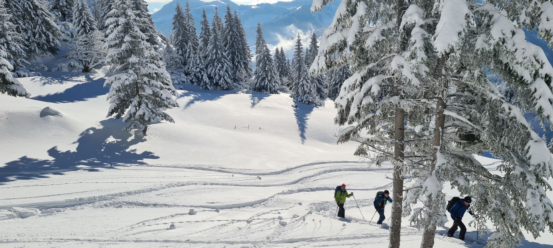 Gefahreneinschätzung: Auf der Normalroute, die übrigens am Morgen nur bis unter das Seewandköpfl gespurt war, unterhalb der Waldgrenze eher mäßige Gefahr: Keine Windzeichen, kein Durchbrechen, die Schneedecke wirkte hier sehr homogen und der Neuschnee hat sich gut mit dem Altschnee verbunden. Bei der Abfahrt in den Soinkessel fühlte sich der Schneedeckenaufbau anders, nicht so homogen an, aber ich habe nicht reingeschaut und es war mehr ein Gefühl.