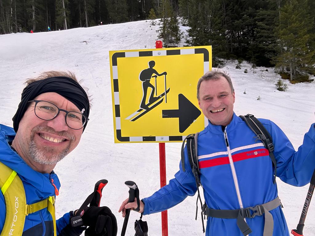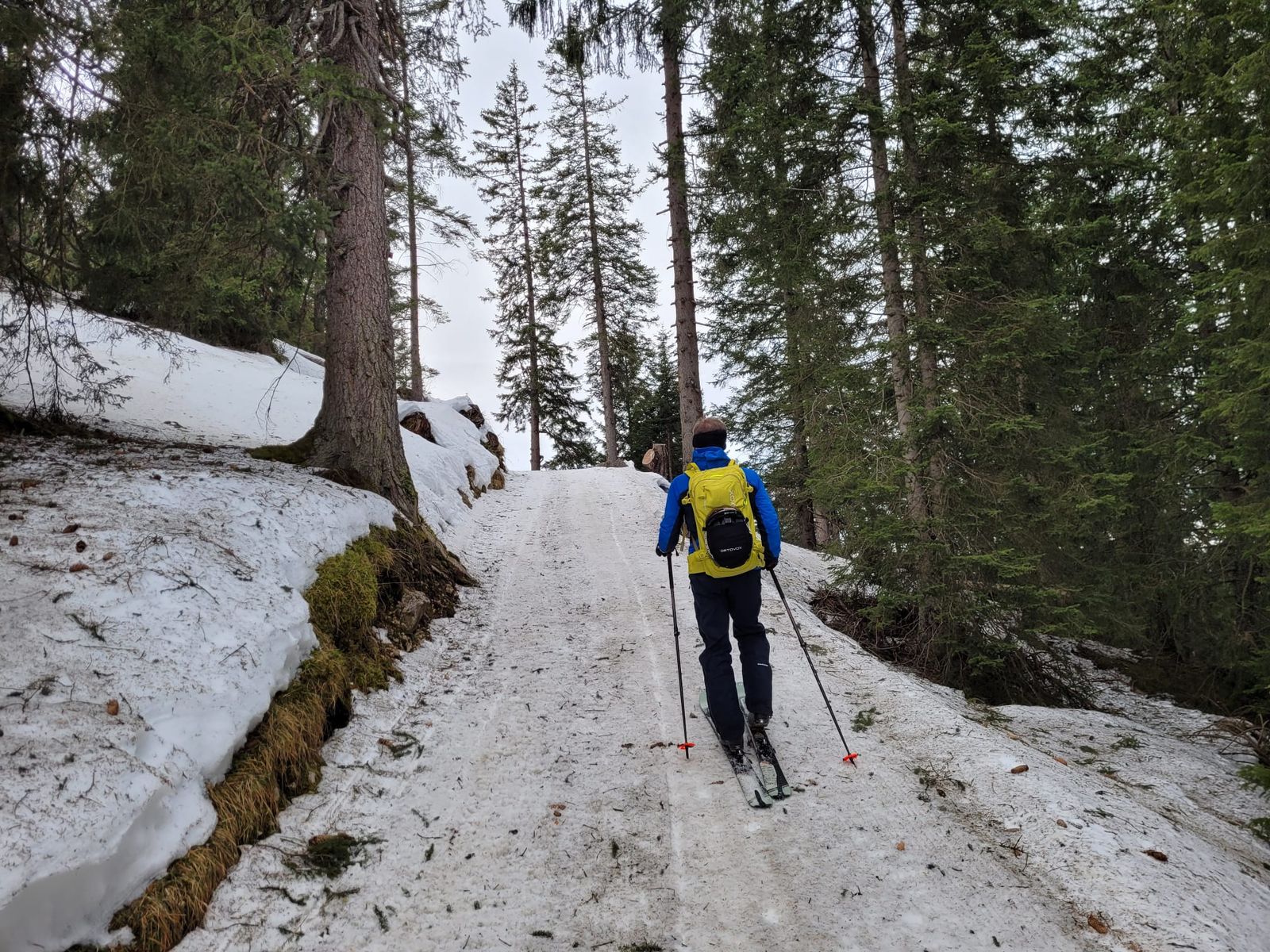 Dort hat sich ein schmales Kunstschneeband den Berg hochgezogen, das wir uns mit den wenigen Skifahrern und ähnlich vielen Tourengehern geteilt haben.