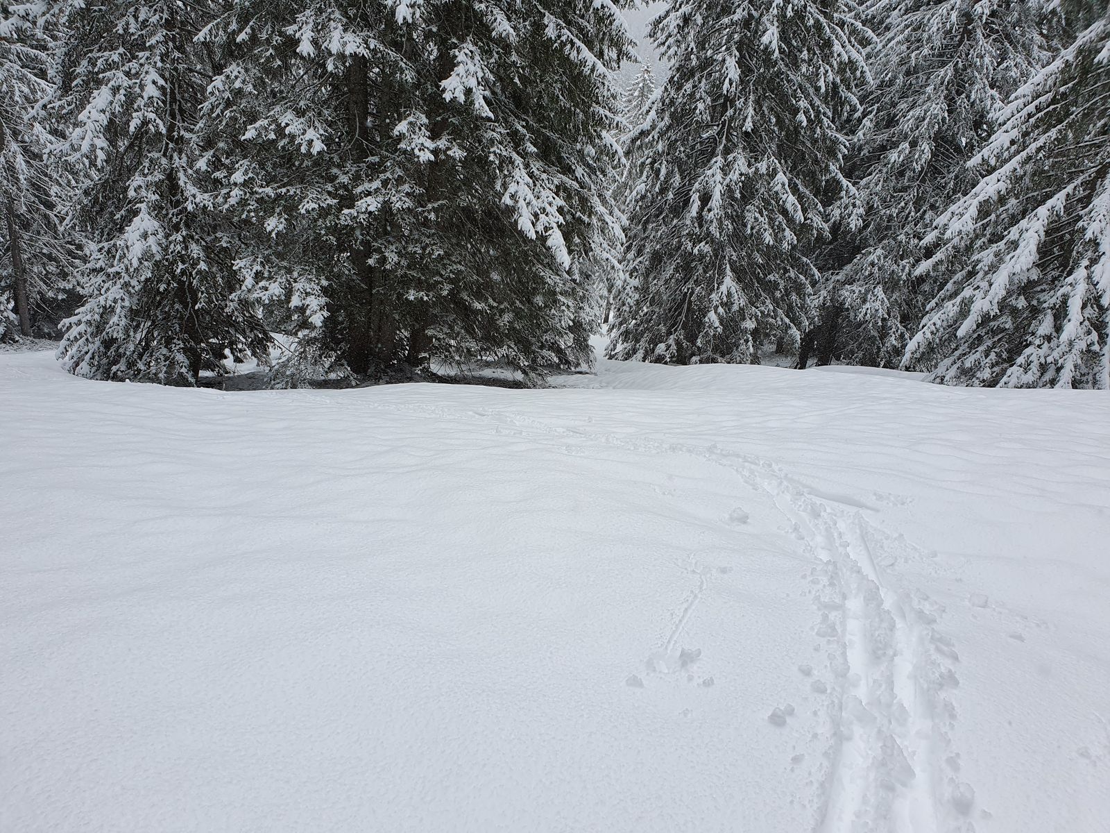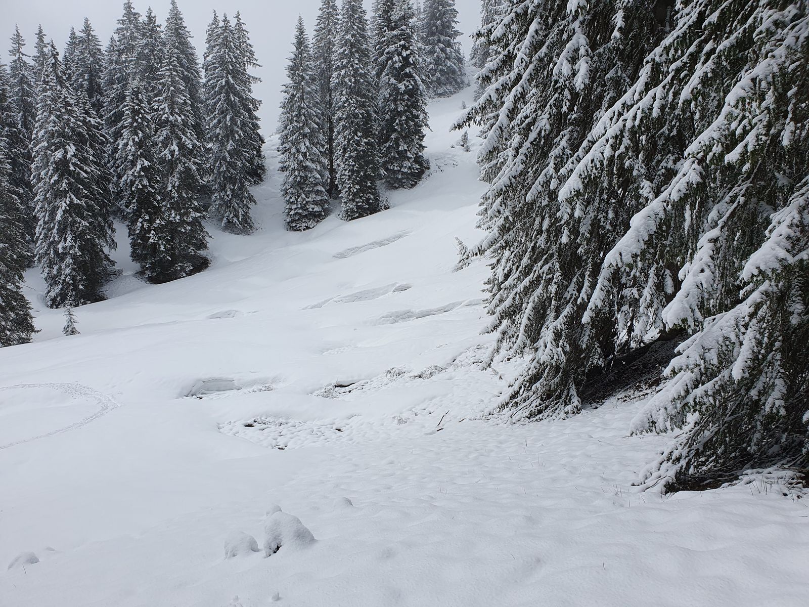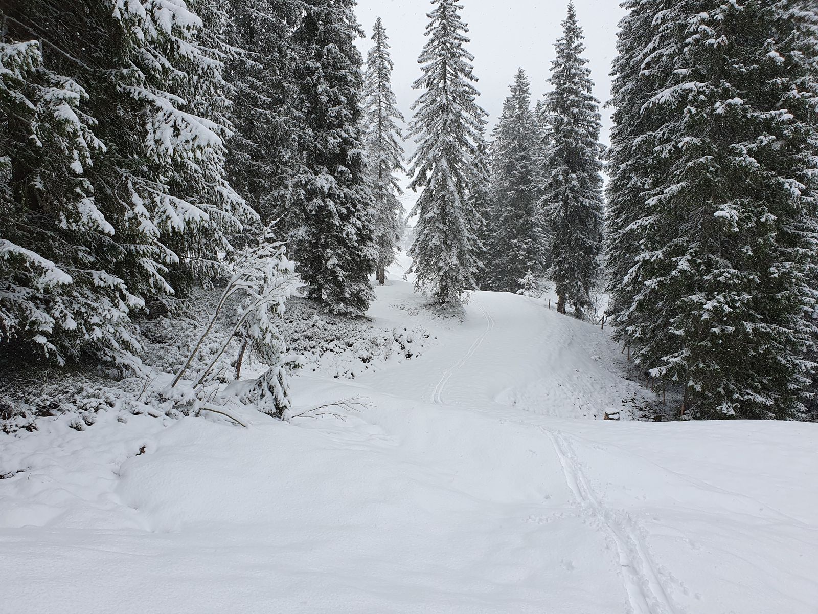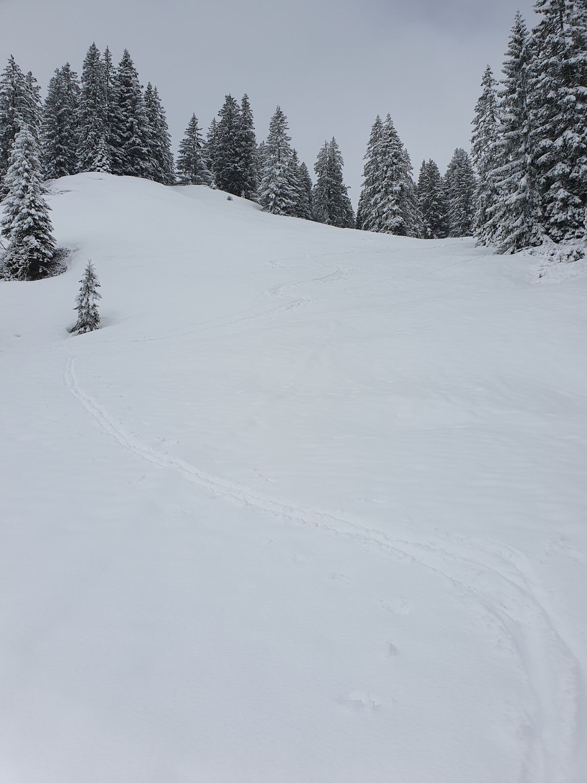 Aus Zeitgründen konnte ich heute nicht alles abfahren was lohnenswert ist. 4 Anstiege über verschiedene Schneisen wurden durch schöne entspannte Abfahrten belohnt. Der Neuschnee hat sich nicht fest mit dem Untergrund verbunden. Dadurch leicht zu schwingen aber trotzdem im nicht zu steilen Bereich ungefährlich.