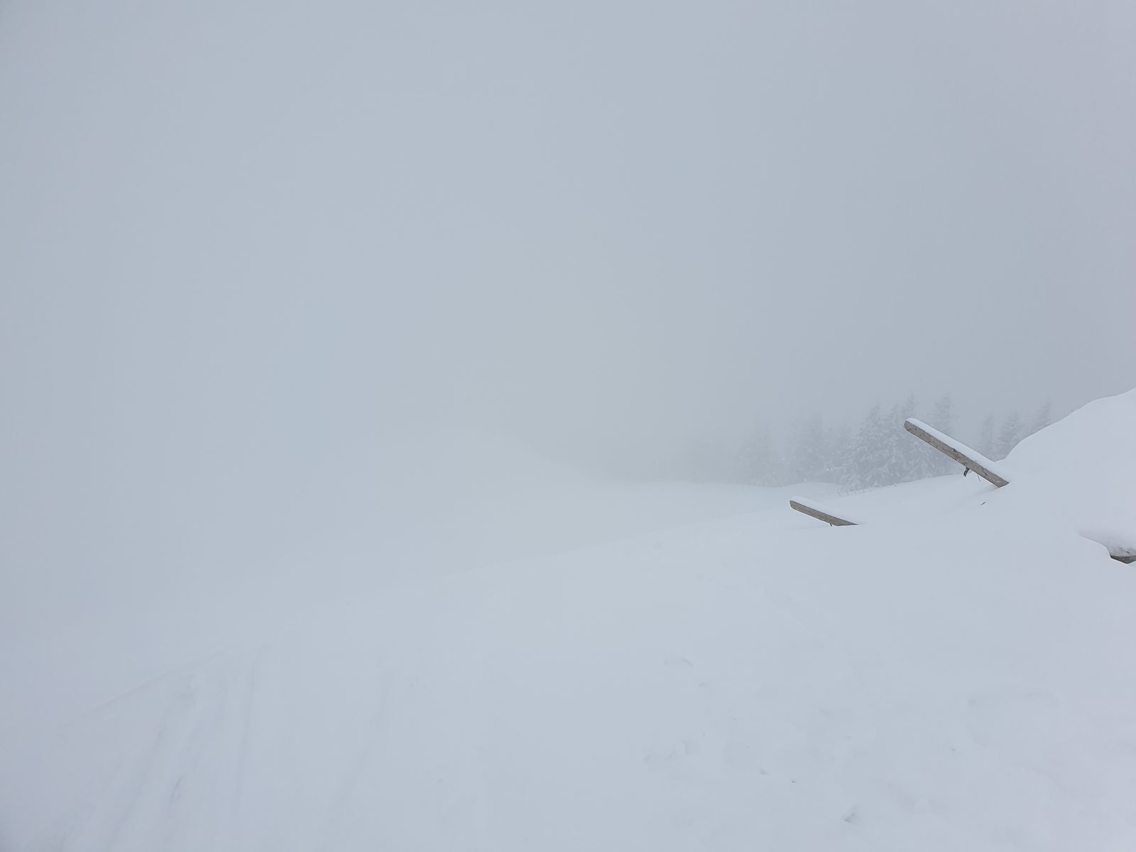 3: white-out am Gipfel: Orientierung an Aufstiegsspur und Waldrand gut möglich