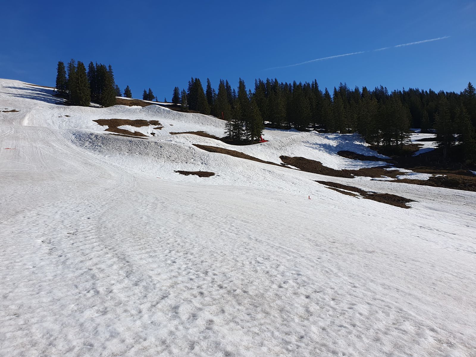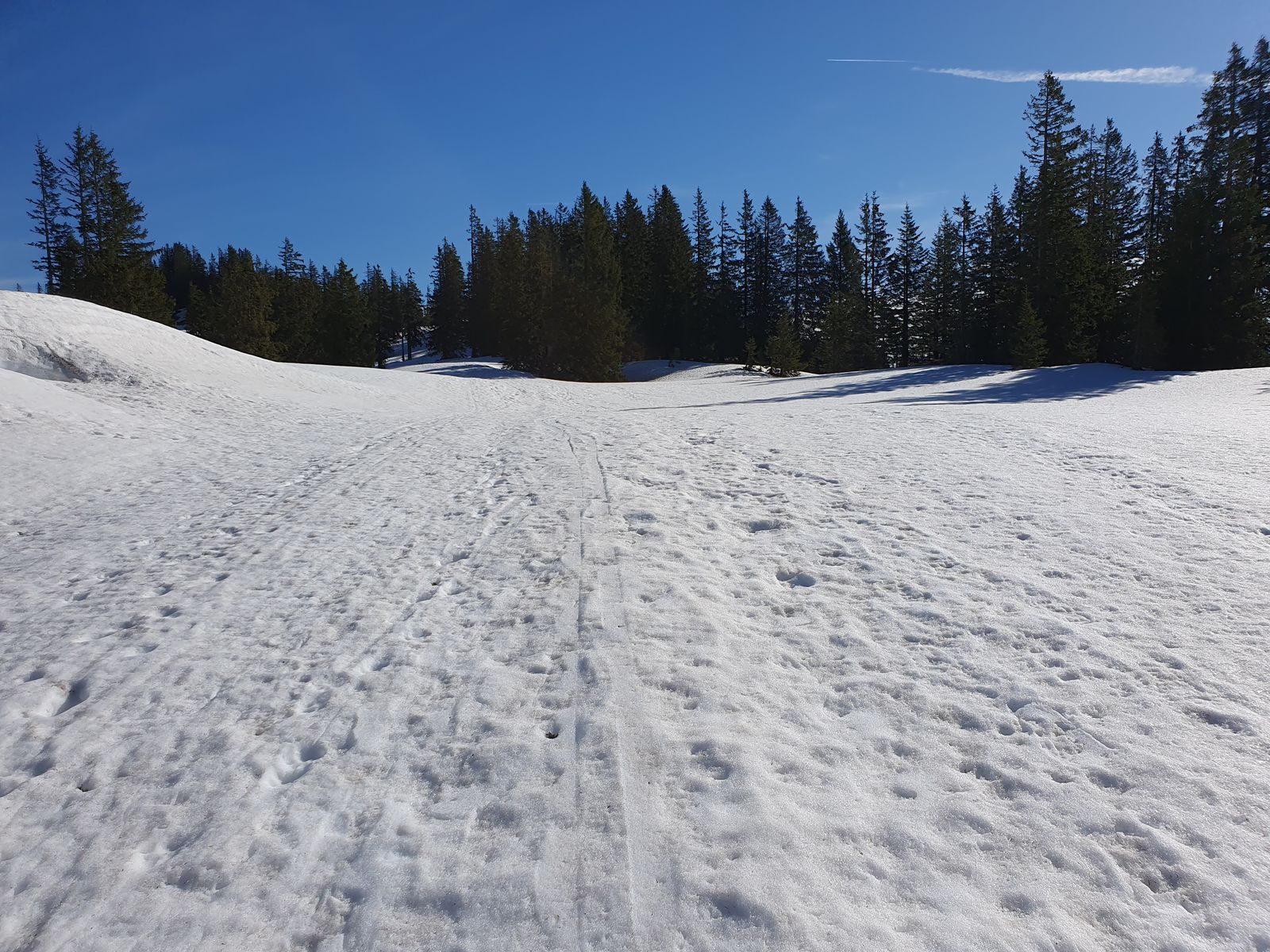 Schneelage + Qualität: erstaunlich gut, es gab bei der Skipiste zum Bolgen eine apere Stelle, die aber sicher So-abend größer wird, und die Waldschneise (die erste ab Lifttalstation, d.h. nach ca. 100m) ist auch für Aufstieg nur brauchbar, wenn man ohne Abschnallen auch nasse Felle in Kauf nimmt. Aktuell sind es nur 2 kürzere grüne Lücken(je ca. 5m).