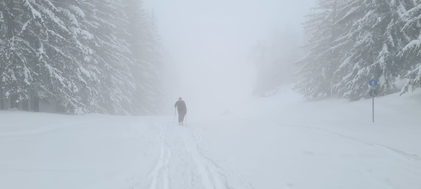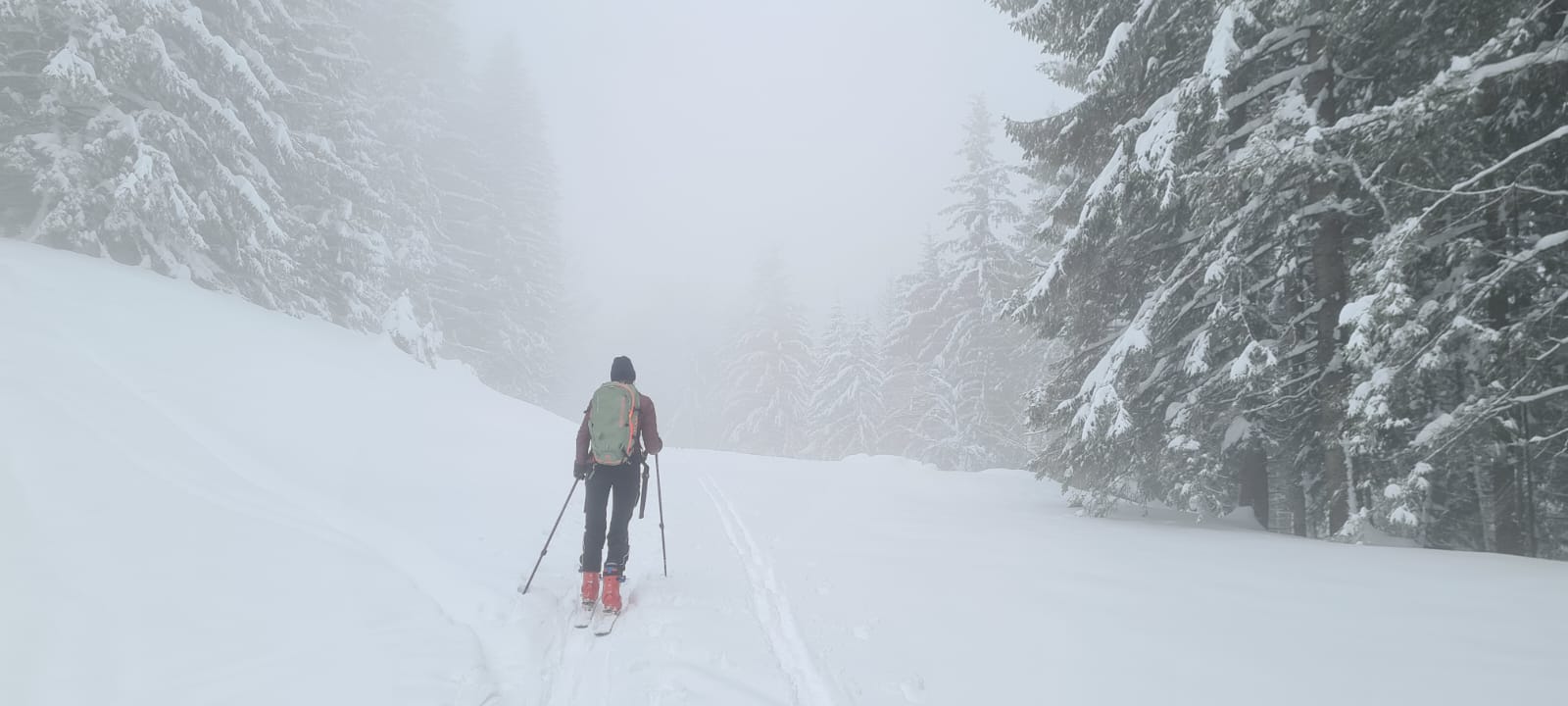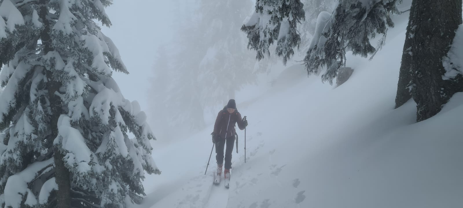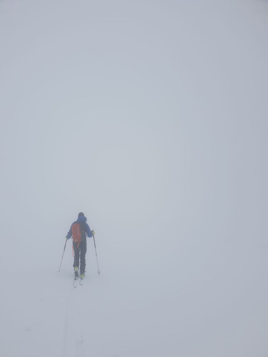 Bis zum Morgen gab es ca. 15 cm fluffigen Neuschnee ohne jeglichen Wind gefallen. Darunter eine nach wie vor feuchte, aber recht kompakte Altschneedecke. Richtung Tanzeck war außer einer 4köpfigen Gruppe niemand unterwegs; und die haben auch an der Schnittlauchmoosalm Schluss gemacht. (Richtung Taubenstein Bergstation sind etwas mehr Leute aufgestiegen.) Entsprechend unverspurt war das Gelände im oberen Bereich unserer Route; der Untere Lochgraben ist freilich ganz gut eingespurt, aber im Augenblick noch super zu fahren, weil pulvrig. Die freien Hänge im oberen Teil boten perfekten Schnee, allerdings bei 0,0 Sicht. Selbst die Alm war erst auf 10 m zu erkennen. Der Schnee war aber dermaßen fehlerverzeihend, dass es trotzdem Spaß gemacht hat.