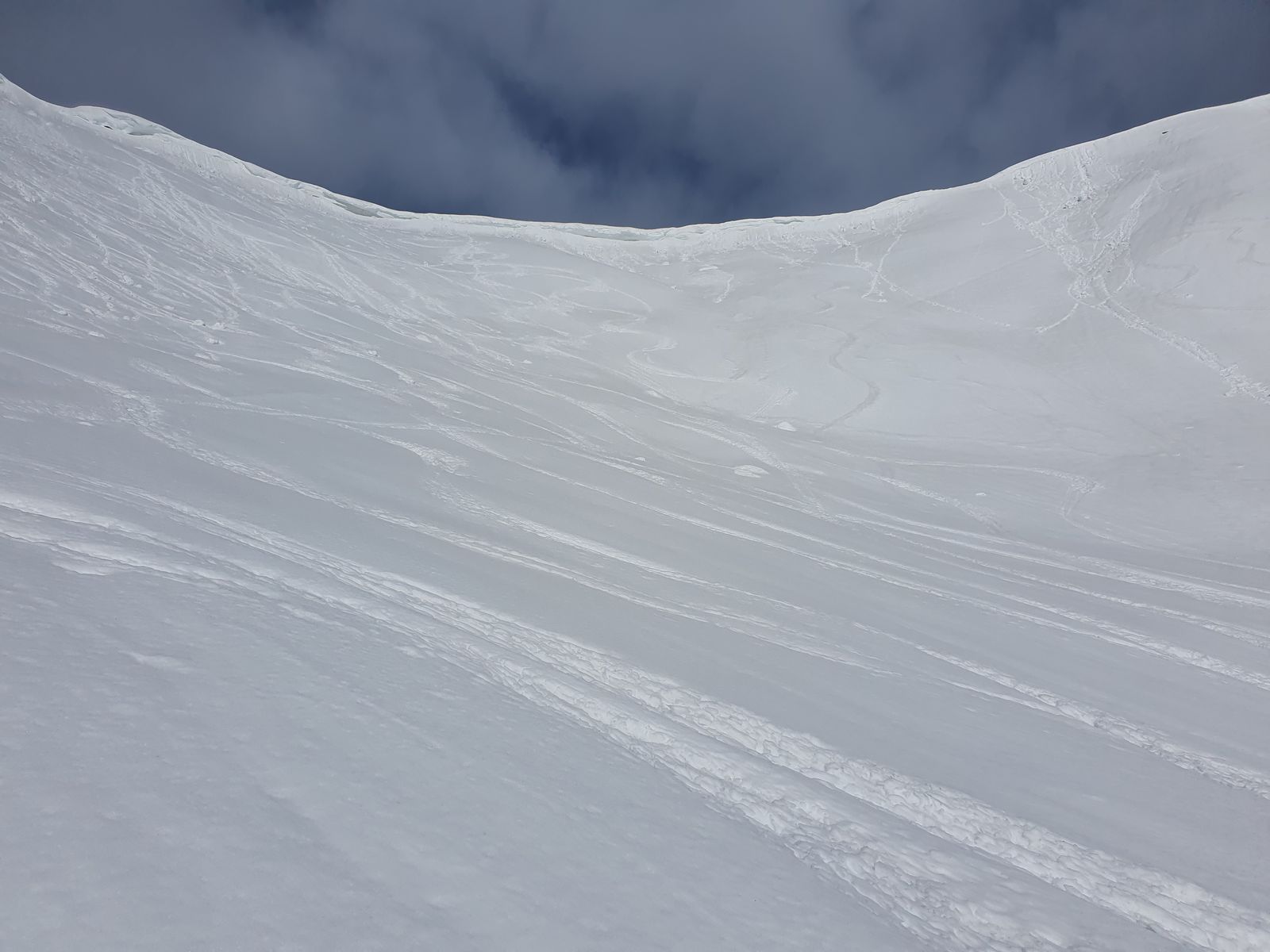 Dann vom Gipfel Richtung Bolgenalpe, d.h. erst unter Meidung der Wächten (Richtung Dreifahnenkopf) erst Richtung häufig genutzter Aufstiegsspur auf Bergrücken vom Bolgensattel,kurz bergab, dann links runter und in diesem Tal weiter runter bis kurz vor Bolgenalpe. War etwas schwer zu fahren, aber ok.