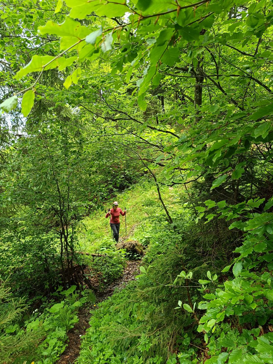 auf dieser ausgedehnten Rundtour: Auf den Aufstieg durch das ebenso urige wie einsame Hühnerbachtal folgt die grandiose Kammwanderung über die Gipfel, um dann wieder in wunderschönen Wald zu münden. Besonders schön ist die Tour wie heute nach Regenfällen, da dann viele der kleinen Bäche munterer plätschern als in trockenen Zeiten. Orientierungssinn ist aber gefragt, da die Tour bis zum Demeljoch unbeschildert und teilweise auch weglos ist.