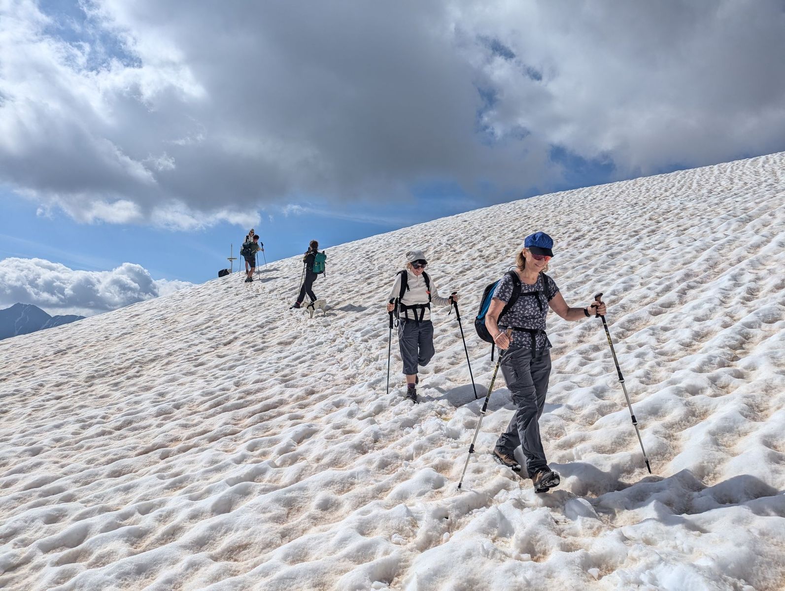 Auf dem Anstieg zum Schrimmennieder Sattel ist ein unproblematisches Altschneefeld zu queren, Die große Wechte am Sattel kann links (also dort war ohnehin die Stahlseile sind) schneefrei umgangen werden. Im weiteren verlauf sind zwei unproblematische Schneefelder zu queren. Ansonsten war alles trocken und schneefrei.