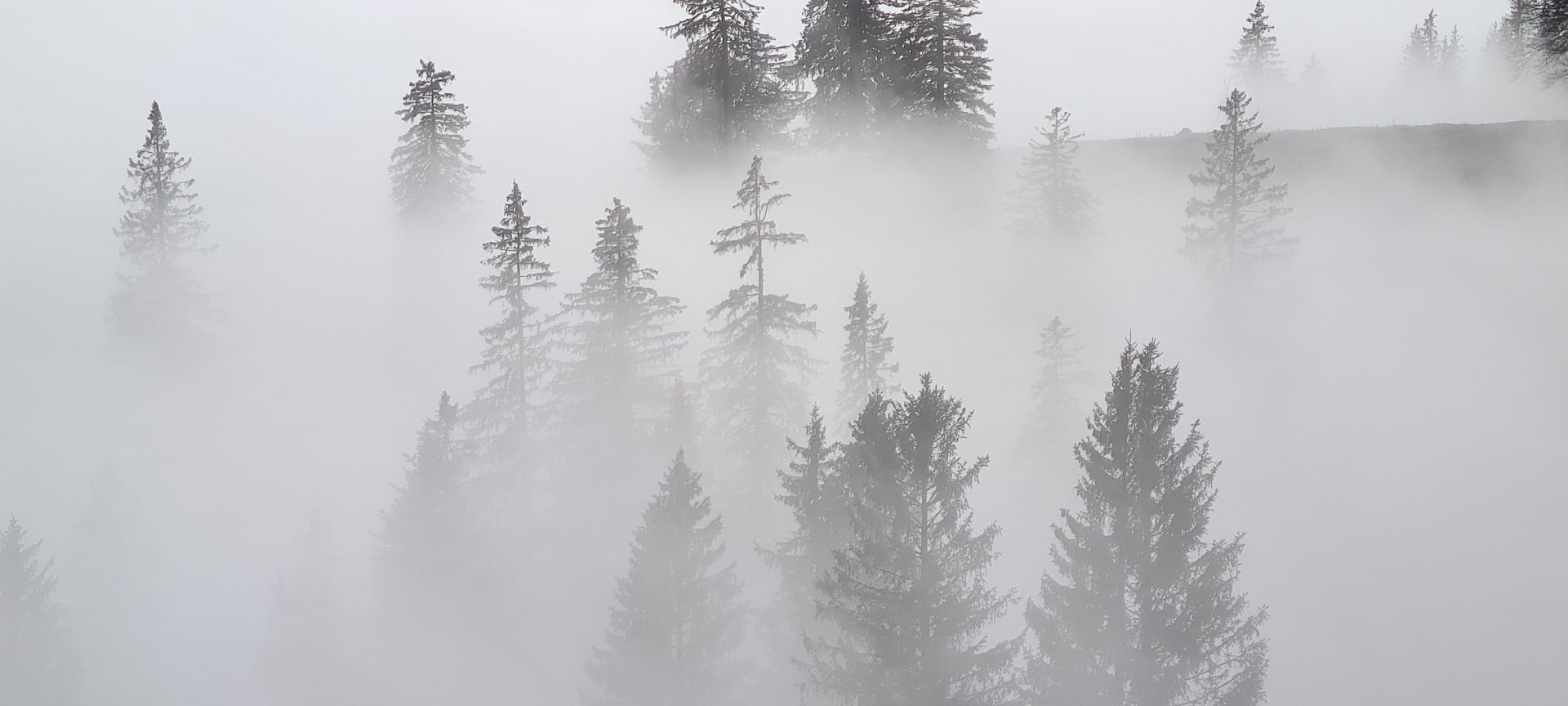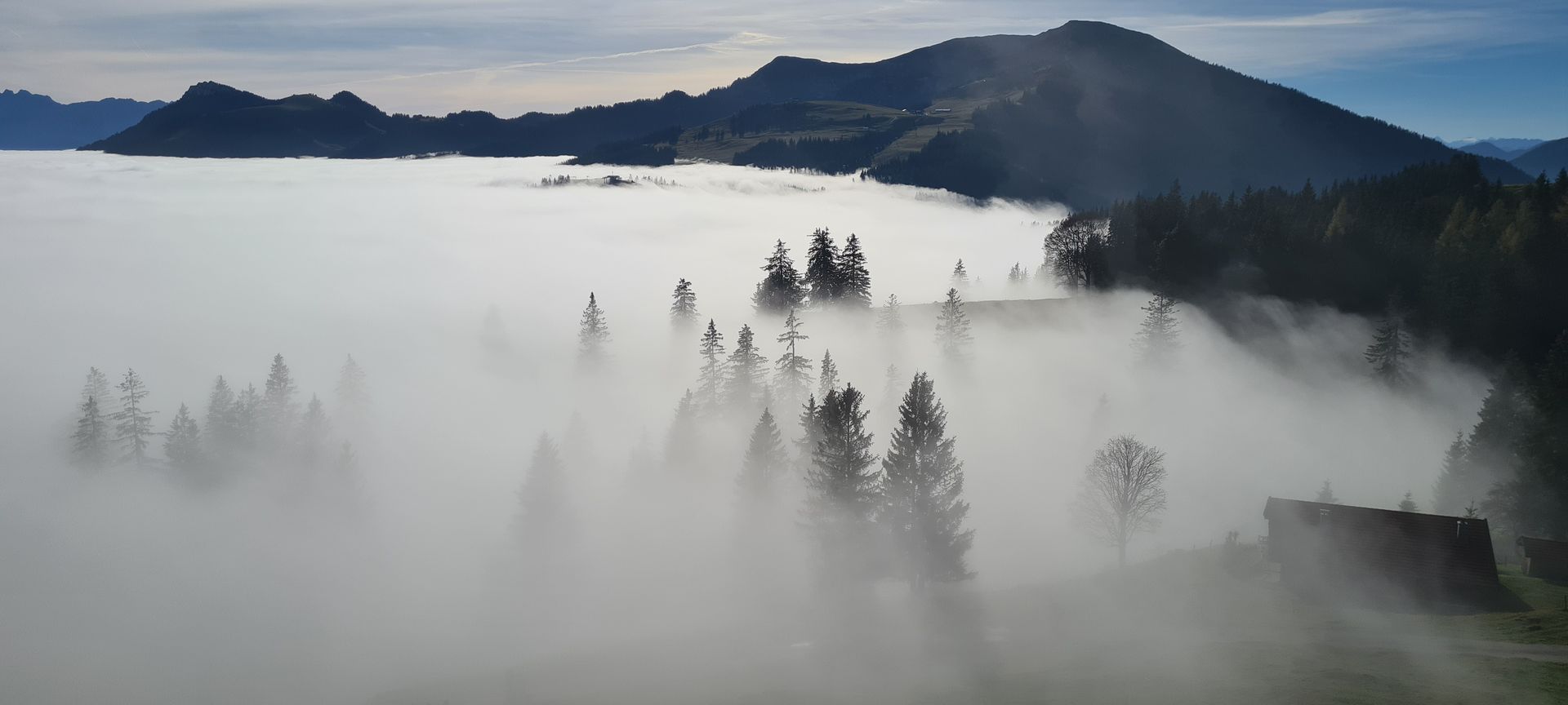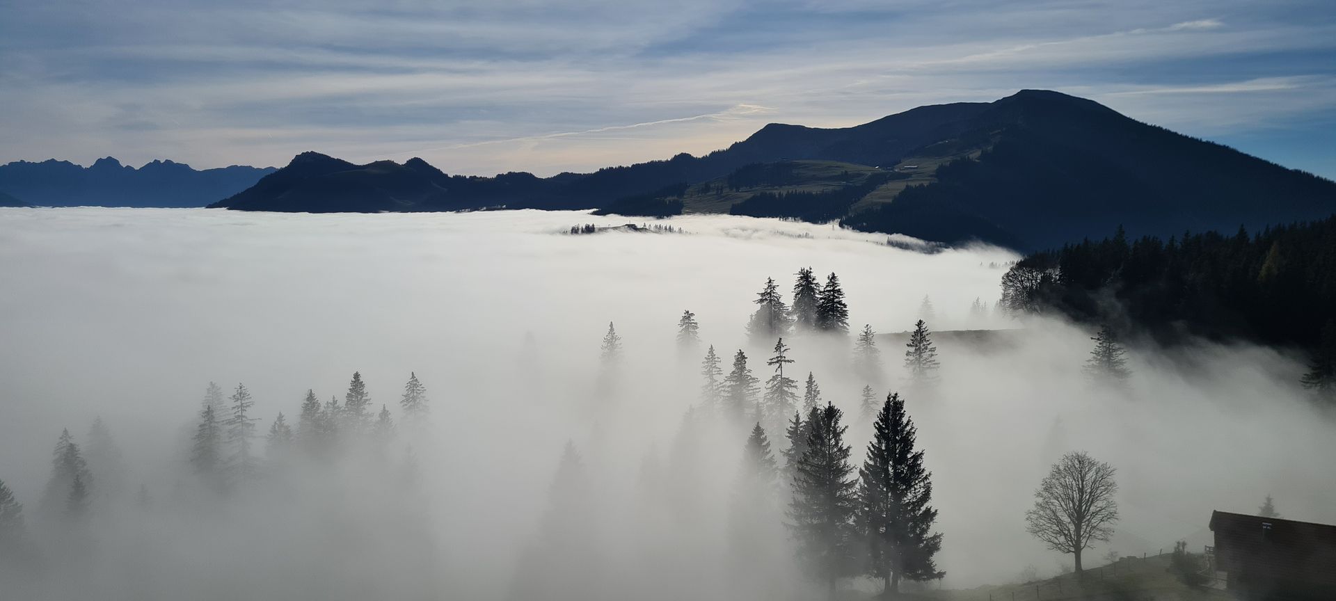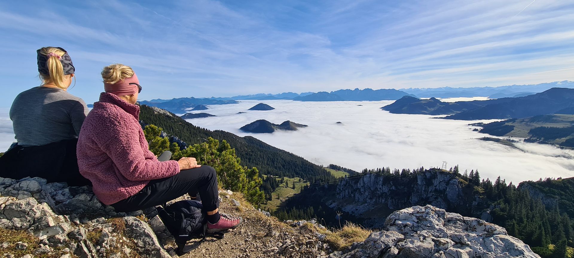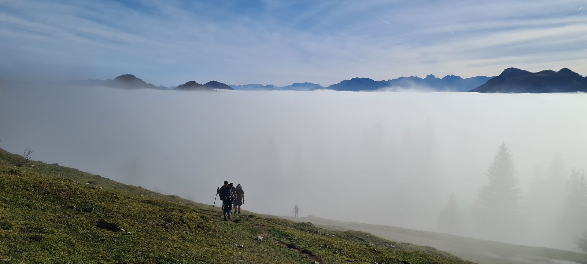 Verhältnisse: Während in Bayrischzell schon die Sonne rauskam, war es am Sudelfeld oben noch wunderbar neblig und so erwartete uns das herrliche Erlebnis, vom Grau ins Licht zu steigen. Es ist immer wieder ein Gänsehautmoment.