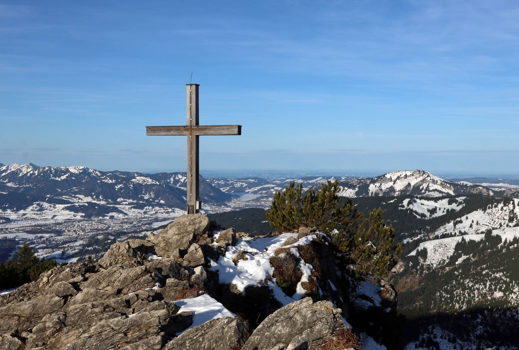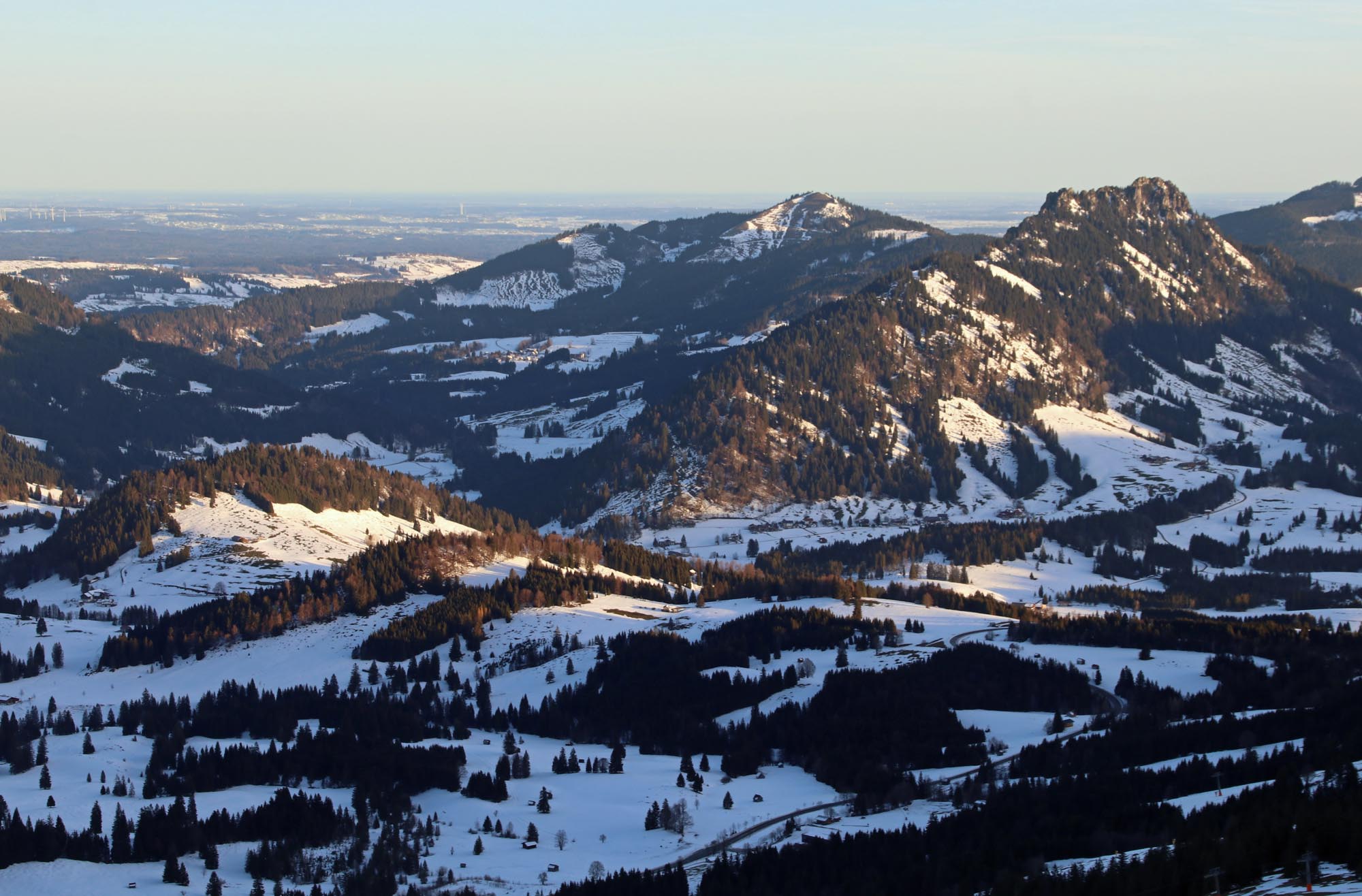 Südseitige Hänge (wie gegenüber am Wertacher Hörnle oder an der Reuterwanne) apern auch im Allgäu langsam wieder aus.