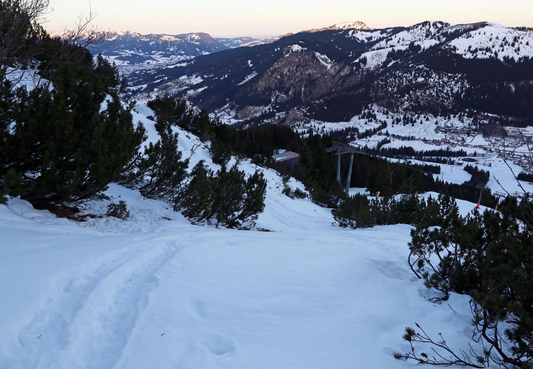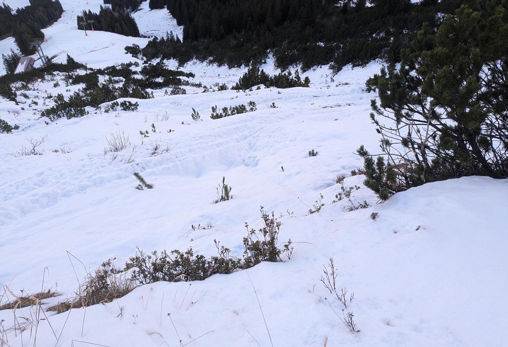 In der Rinne oberhalb der Bergstation konnte man noch ein gutes Stück mit Ski aufsteigen und es waren auch zwei, drei Abfahrtsspuren zu sehen. Ich hielt dort abzufahren wegen möglicher Vegetationsschäden für keine gute Idee und bin mit den Ski am Rucksack dann wieder bis zum Beginn der Skipiste abgestiegen.