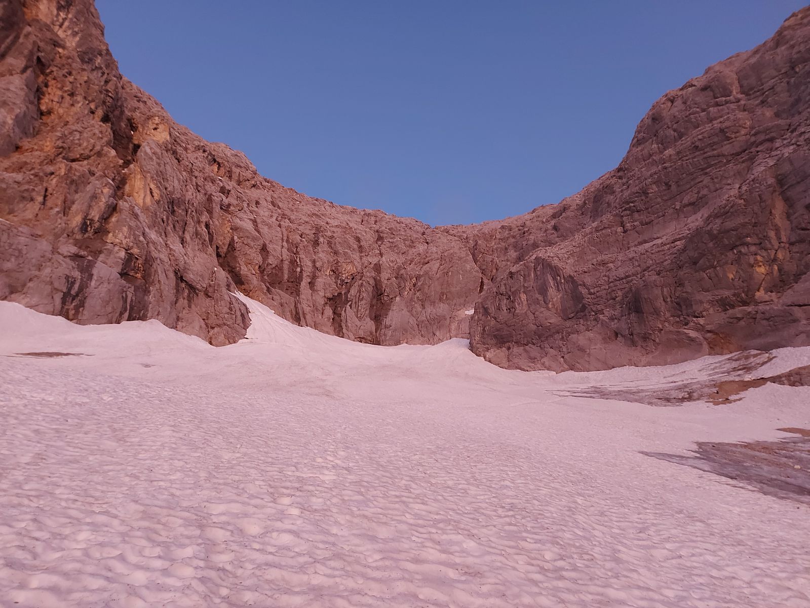 Nach der Irmerscharte gibt es noch 2 Schneefelder. Beim ersten liegen die Seile gut erreichbar, aber man muss drüber laufen. Beim zweiten nicht mehr. Hier gibt es zwar tiefe Spuren, aber da wir um sehr früh oben waren waren diese noch gefroren. Ich hatte einen Pickl dabei, und damit ging es ohne Probleme.