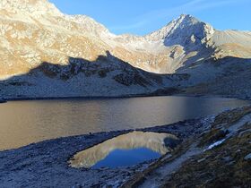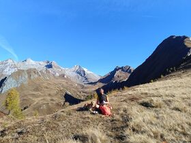 Fazit: Das war eine wunderschöne Tour mit Freunden. Die Landschaft ist sehr abwechslungsreich mit vielen schönen Seen am Weg. Besonders hervorzuheben sind die momentan in höchstem Glanz leuchtenden herbstlichen Lärchenwälder. Für mich persönlich eine klassische Herbsttour, da gerade die hier beschriebene Etappe extrem südseitig ist und mir die baumlosen Steilwiesen im Sommer sicher zu heiß wären.
